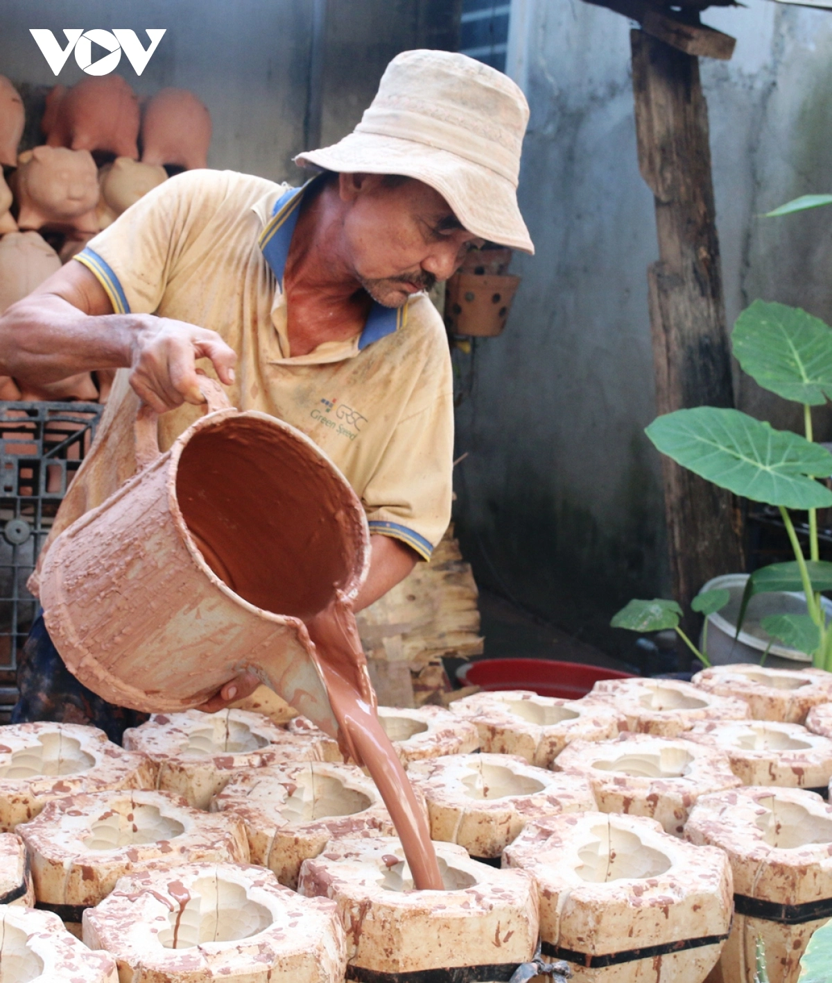 Đất sau khi trộn xong sẽ được đổ khuôn, tạo hình linh vật. Theo ông Cường, chủ lò gốm ở phường Tân Phước Khánh, TP. Tân Uyên, năm nay, sức mua yếu nên gia đình ông làm khoảng 1.000 con rồng để bán Tết.