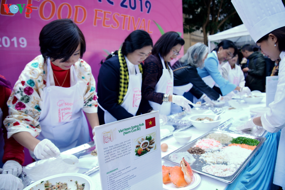 | Các nhân viên đại sứ quán các nước "thử sức" với đặc sản nem cua bể của Việt Nam. |