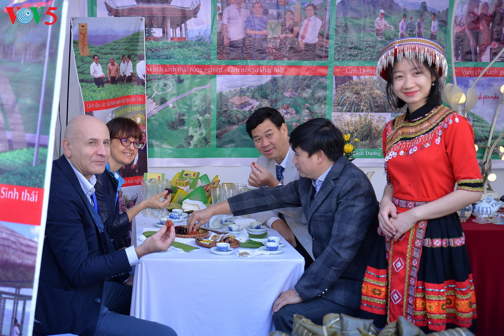 | Du khách quốc tế nếm thử đặc sản tại gian hàng của Hà Giang |