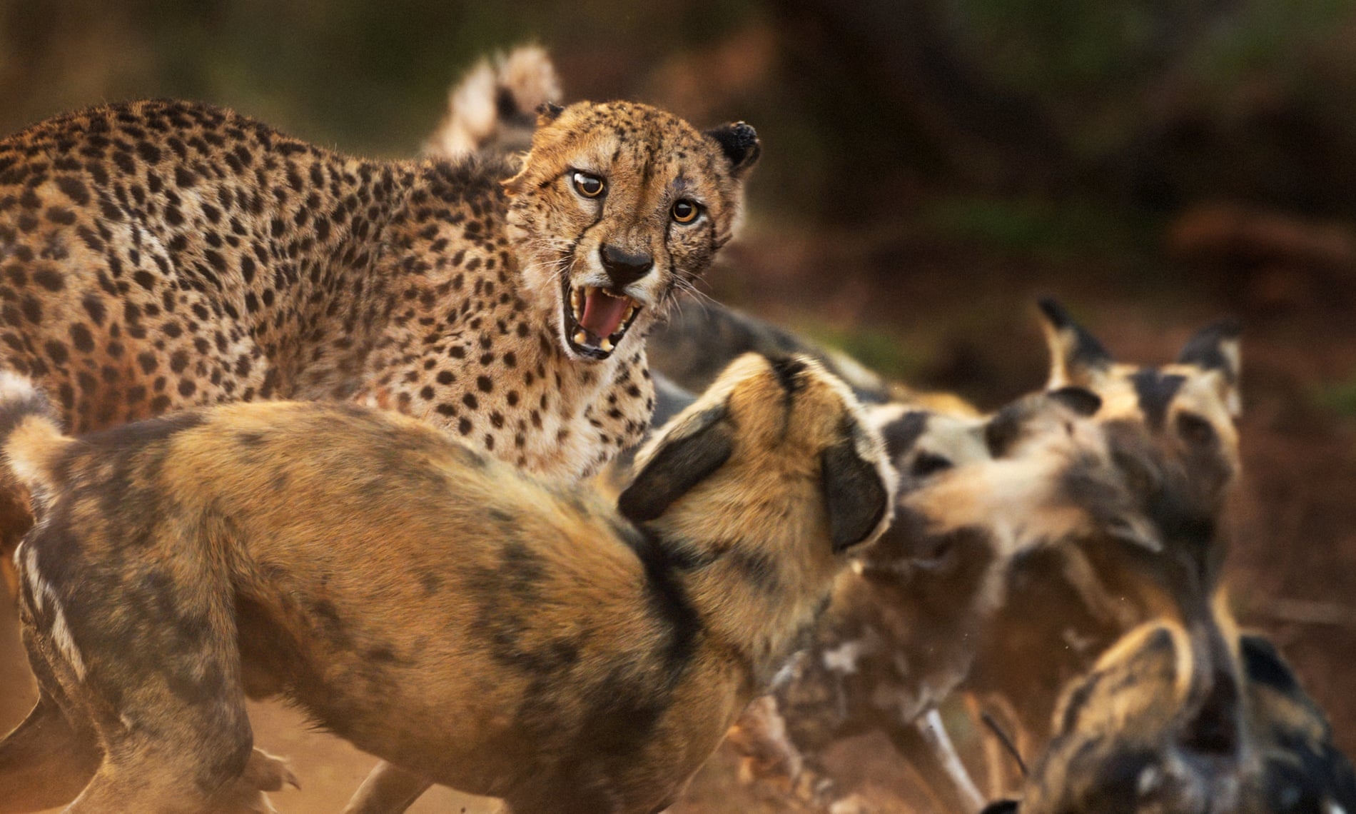 Một con báo cheetah đực đang chống lại sự tấn công của đàn chó hoang châu Phi. Số lượng của cả hai loài này đang giảm rõ rệt. Hiện nay, chỉ còn gần 7000 con sống rải rác tại khu bảo tồn động vật hoang dã Zimanga Private Game Reserve, khu vực KwaZulu-Natal (Nam Phi). Ảnh: Peter Haygarth |
