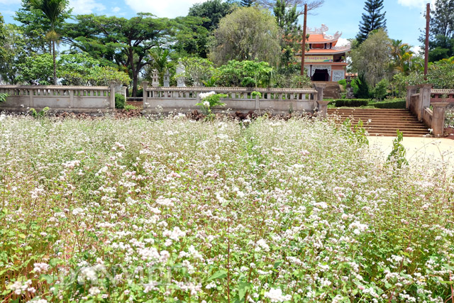 Hoa tam giác mạch Đà Lạt được trồng nhiều trong những nông trại với mục đích là thức ăn cho gia súc, vì thế chất lượng cây hoa được chăm sóc tốt. Du khách có cơ hội ghé thăm những cánh đồng trắng muốt, hoa mọc dày phủ kín đất. Thời điểm hoa tam giác mạch Đà Lạt nở nhiều nhất là tháng 9 đến tháng 11. Trong hình là cánh đồng tam giác mạch ở chùa Vạn Đức. Ảnh: Dân Việt.