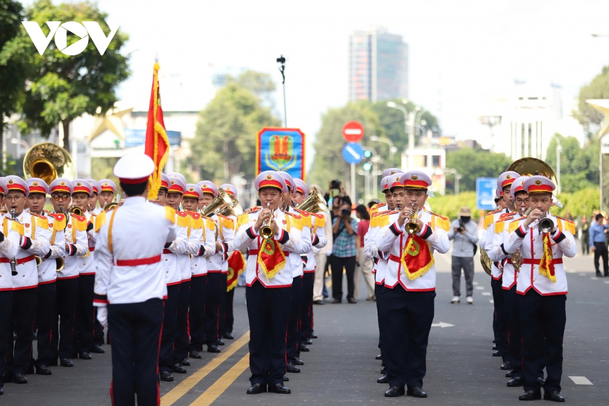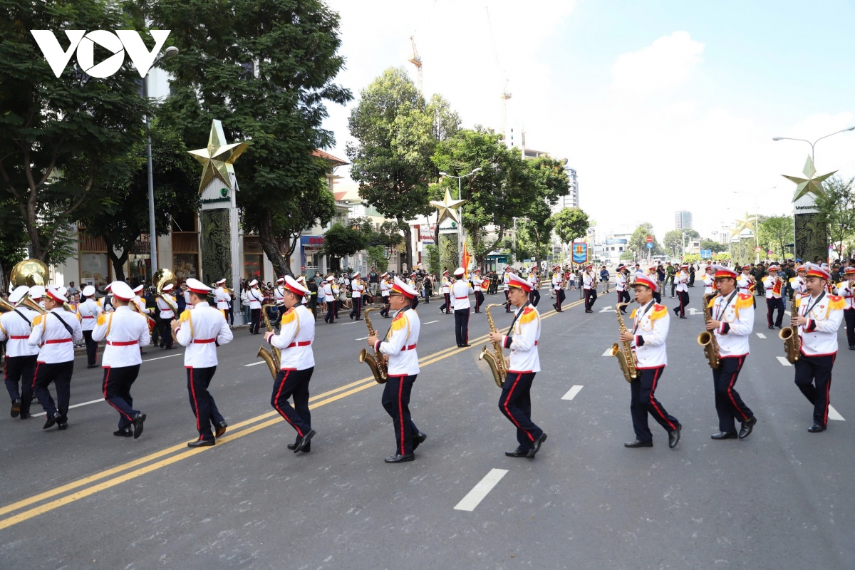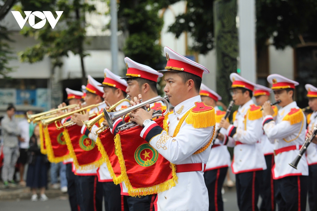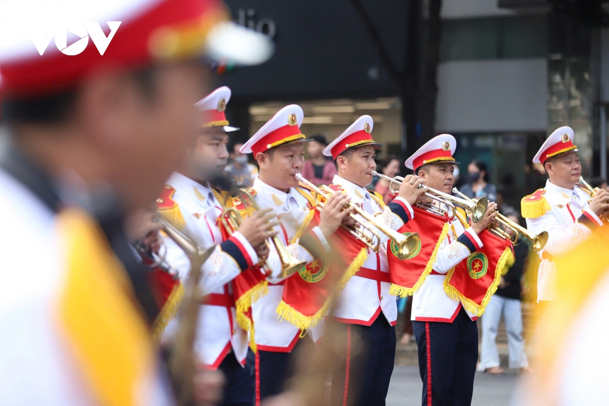 Đoàn biểu diễn nhạc kèn kết hợp với diễu hành, xếp hình trên đường phố ở trung tâm TP.HCM.