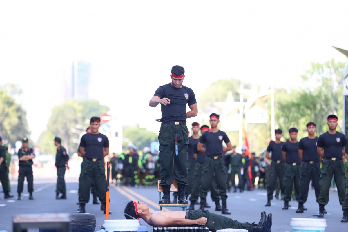 Lực lượng cảnh sát đặc nhiệm biểu diễn những pha võ thuật khí công như: dùng tay chặt gạch, lưng trần nằm trên bàn chông công phá đá, tay xách vật nặng đi chân trần trên mảnh vỡ thuỷ tinh, dùng bụng đỡ dao phóng từ trên cao...