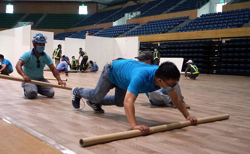 Sáng 1/8, ngay sau Đà Nẵng thống nhất việc xây dựng cơ sở điều trị Covid-19 tại Cung thể thao Tiên Sơn (quận Hải Châu, TP Đà Nẵng), đơn vị phụ trách Cung đã tiến hành thu dọn, tạm thời di chuyển sang địa điểm làm việc mới để phục vụ việc lắp đặt, dựng phòng bệnh điều trị. |