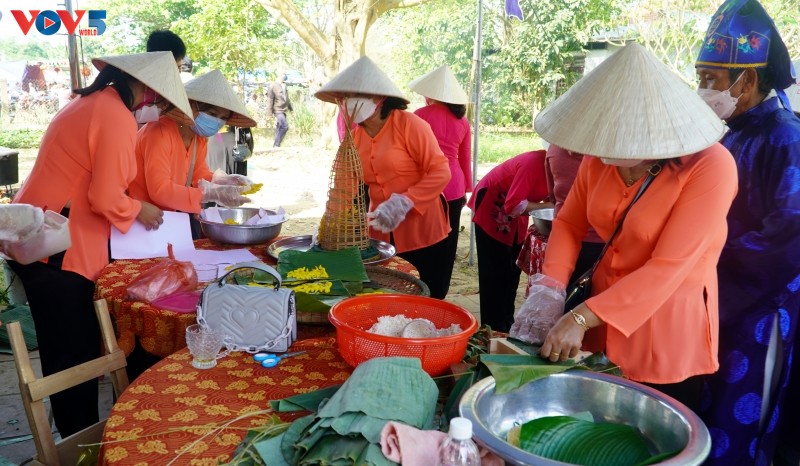 Phụ nữ cùng nhau chuẩn bị tươm tất cho Lễ hội Bà Thu Bồn. |