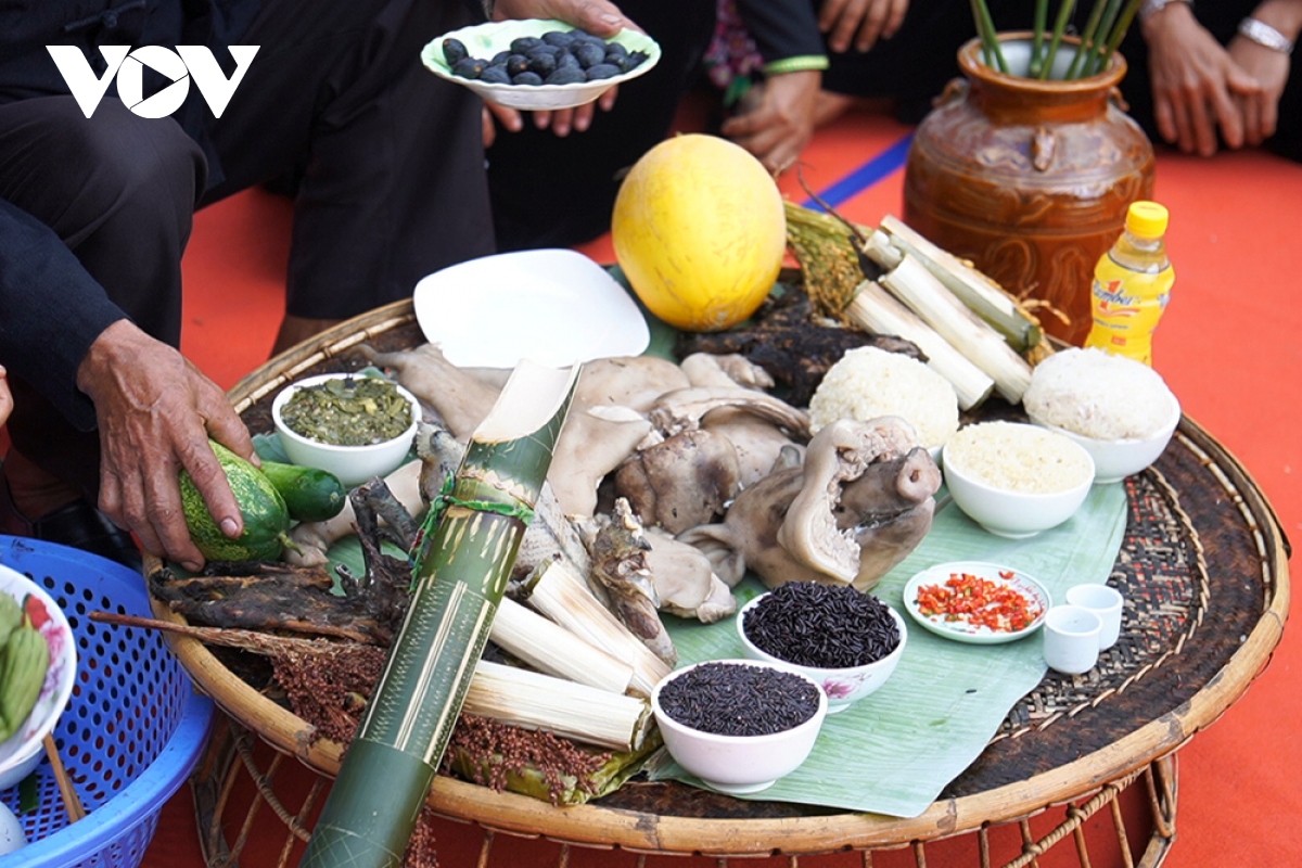 Đồng bào Khơ Mú quan niệm, mâm lễ càng đầy, càng nhiều sản vật thì càng thể hiện sự no đủ, phát đạt của gia đình, làng bản. |