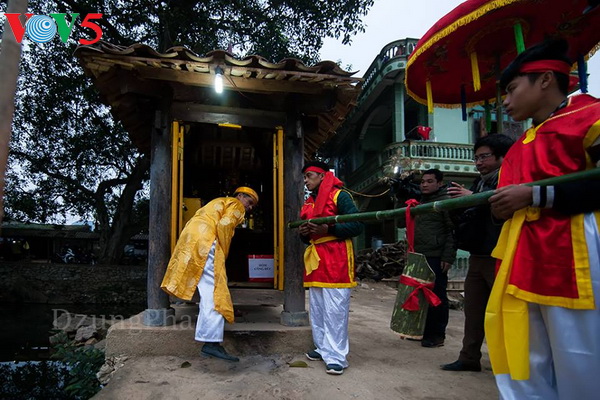 Ngay từ tờ mờ sáng, ông Mo, Hội và các anh Tưởng đã vào đình lấy ống bương đựng nước, ra làm lễ tại miếu thờ đức Vua Miêu Tĩnh (một cách gọi tên ẩn ý vì Thái Tổ Mạc Đăng Dung sinh năm Quý Mão – 1483) và xin “nước Tiên” về để dâng vua. (Ảnh: Phạm Quốc Dũng)