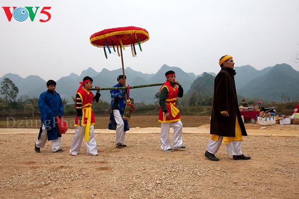 Đầu tiên, đoàn rước sẽ rước Long ngai, Bài vị của đức Vua từ đình Làng Mỏ về miếu Xa Vùn, để đức Vua ngự…chờ con cháu rước các loại đồ lễ dùng để cung tiến. (Ảnh: Phạm Quốc Dũng)