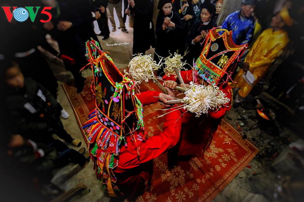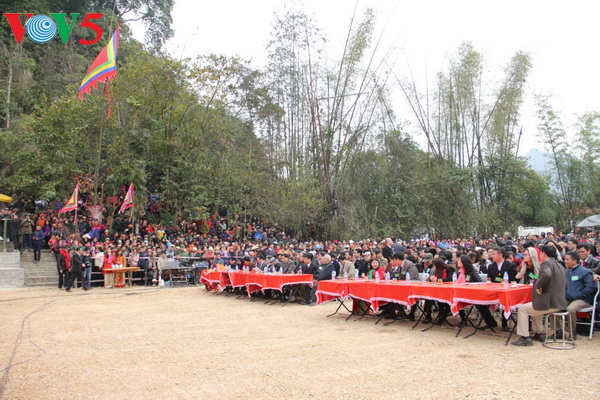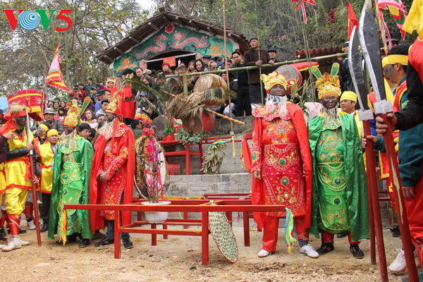 Khi tất cả lễ vật đã được tập trung trước miếu Xa Vùn để dâng đức vua Miêu Tĩnh (tức Thái Tổ Mạc Đăng Dung), quân tướng xếp thành hai hàng ở hai bên cửa miếu, tựa như các kiêu binh khi xưa đứng tại sân chầu của nhà vua. Các đồ trống, chiêng được cất vào trong miếu, cờ được cắm trước cửa và hai bên miếu.. (Ảnh: Trần Kim Thanh)
