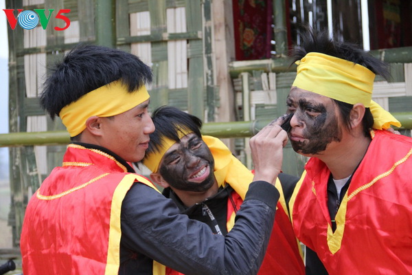 Trong đám rước ngoài ông mo, hai ông hội và 4 người rước long ngai, bài vị không phải bôi đen mặt còn lại tất cả phải bôi mặt đen để cho mọi người không nhận được ra mình. Làm như vậy để giống với quân giặc, tà ma không nhận ra mình mà bắt hay làm hại. Tục lệ này có nét tương đồng với thực tế lịch sử lúc bấy giờ, người họ Mạc bị chúa Trịnh truy sát, phải hóa trang, đổi họ, trốn chạy các nơi. (Ảnh: Trần Kim Thanh)
