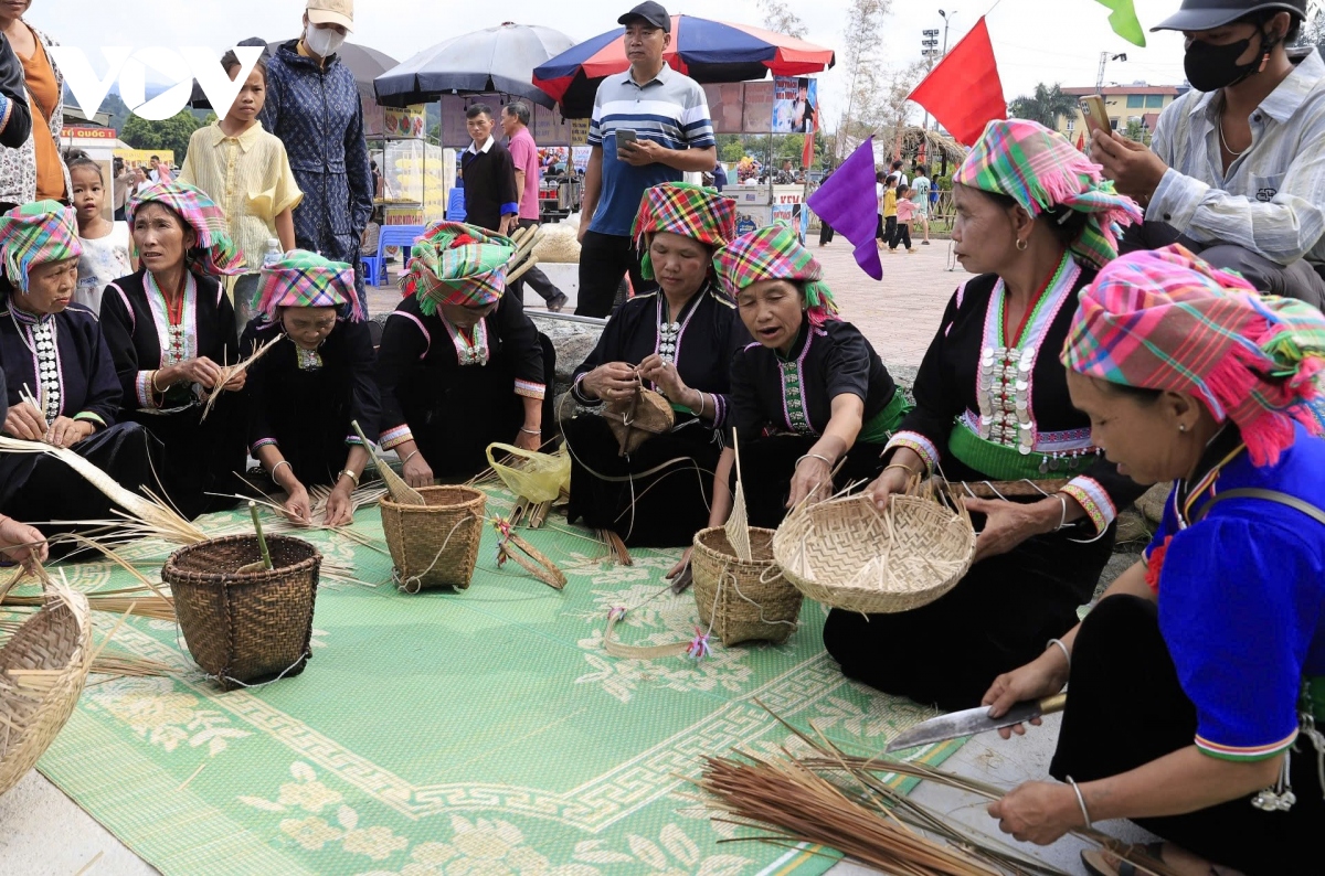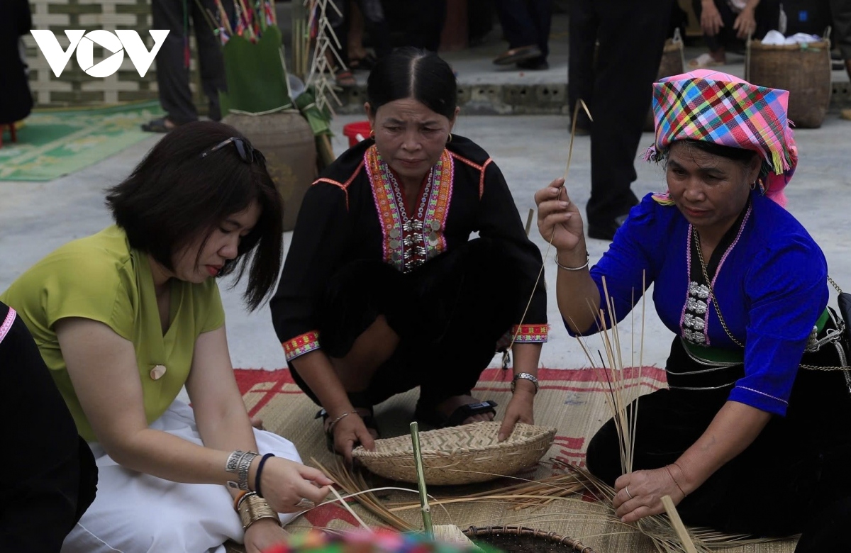 Đến thăm bản làng người Khơ Mú những ngày diễn ra lễ hội, du khách sẽ được bà con hướng dẫn cách thức sản xuất các dụng cụ, đồ vật từ mây tre đan. |