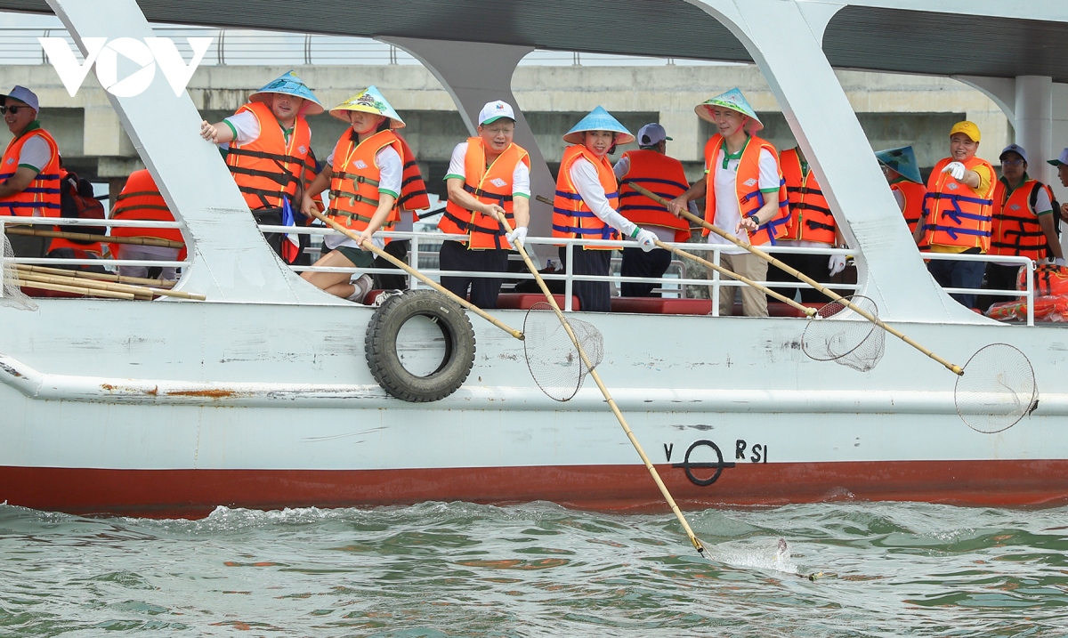 Các đại biểu cùng thu gom rác trên mặt nước quanh Cảng tàu khách Quốc tế Hạ Long. Đại sứ Liên minh Châu Âu tại Việt Nam Julien Guerrier cho biết, ông ấn tượng khi gần như không vớt được rác trong lúc di chuyển gần 1 giờ đồng hồ quanh khu vực này. Đại sứ cũng đánh giá cao các cam kết của Việt Nam hướng tới xây dựng nền kinh tế xanh, tuần hoàn và khẳng định EU sẽ luôn đồng hành và hỗ trợ Việt Nam triển khai các sáng kiến ứng phó với biến đổi khí hậu và bảo vệ môi trường, hướng tới hoàn thành các Mục tiêu phát triển bền vững. |