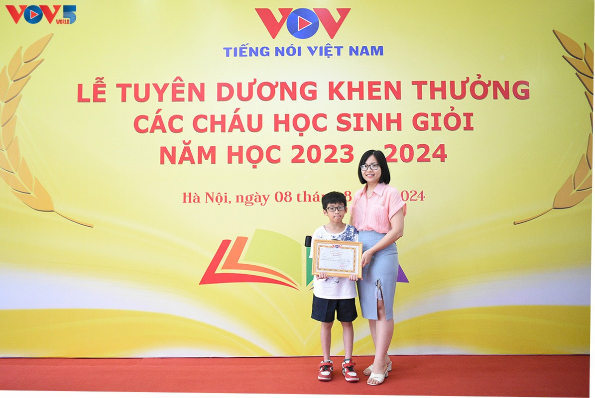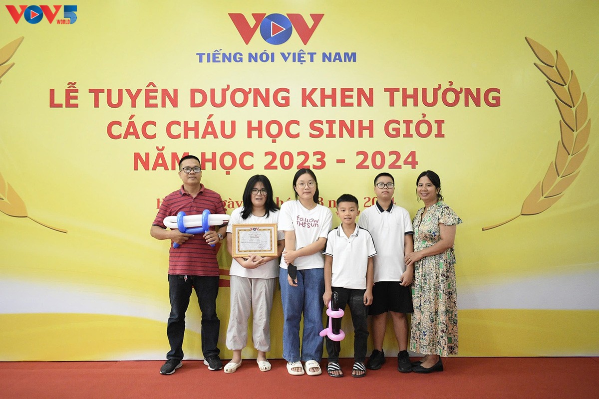 Nhân dịp này, Phó Tổng Giám đốc, Chủ tịch Công đoàn Đài TNVN Vũ Hải Quang; Phó Bí thư chuyên trách Đảng uỷ Đài TNVN Nguyễn Văn Chí; Giám đốc Trung tâm Nghiên cứu và Ứng dụng công nghệ truyền thông, Phó Chủ tịch Công đoàn Đài TNVN Dương Hồng Hải; Chánh Văn Phòng Đài TNVN Nguyễn Thành Chung; Phó Tổng Biên tập phụ trách Báo Tiếng nói Việt Nam Nguyễn Mạnh Thắng đã tặng bằng khen cho đại diện các cháu đạt học sinh Giỏi trong năm học 2023- 2024: