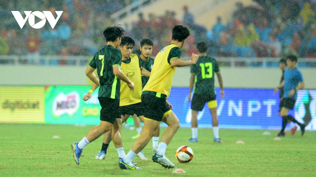 2' Cú đá đầu tiên trong trận thuộc về U23 Việt Nam. Văn Tùng sút bóng đi chệch khung thành của thủ môn Kawin.