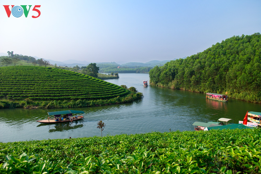| Đảo chè được bao phủ bởi đập Cây Cau nước trong xanh tạo nên một phong cảnh vô cùng thoáng mát. |