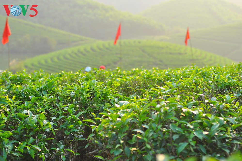 | Phong cảnh thiên nhiên tươi đẹp, bao trùm không gian là một màu xanh đầy sức sống của cây chè. |