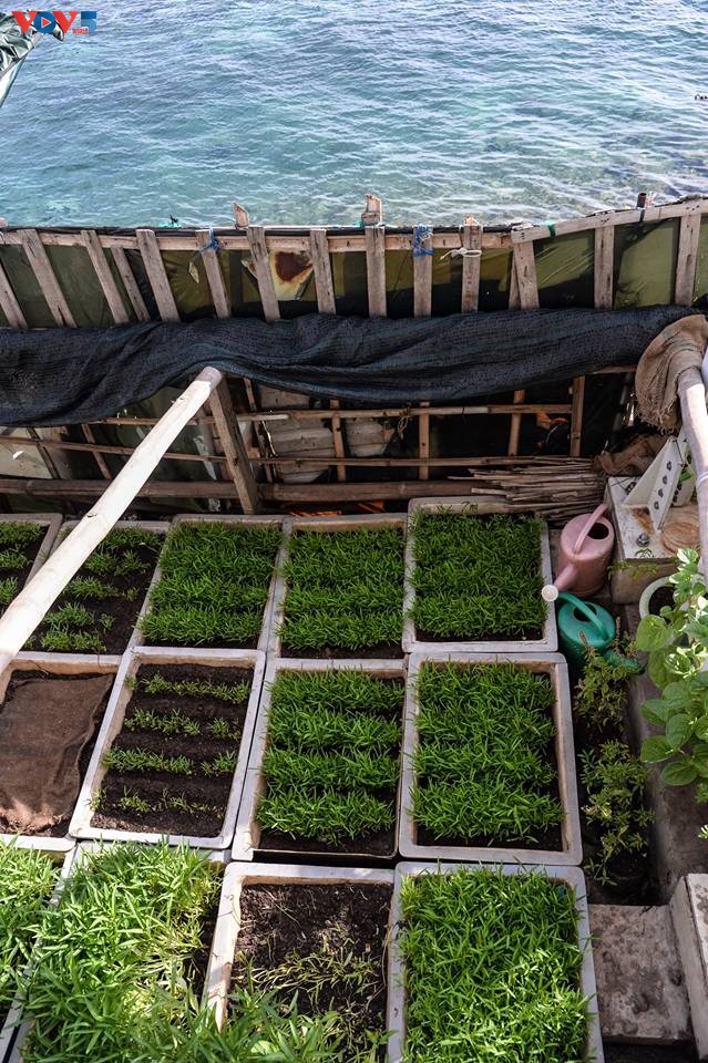 "Vườn rau trên mặt biển" với những chậu xốp đựng đất được chở từ đất liền ra. |