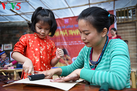 Các em nhỏ rất thích thú được trải nghiệm tự in tranh khắc gỗ dân gian trên giấy điệp truyền thống do