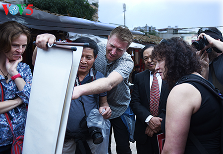 Bên cạnh các ông đồ thường có thêm người phụ giúp dùng máy sấy để sấy cho mực khô nhanh.