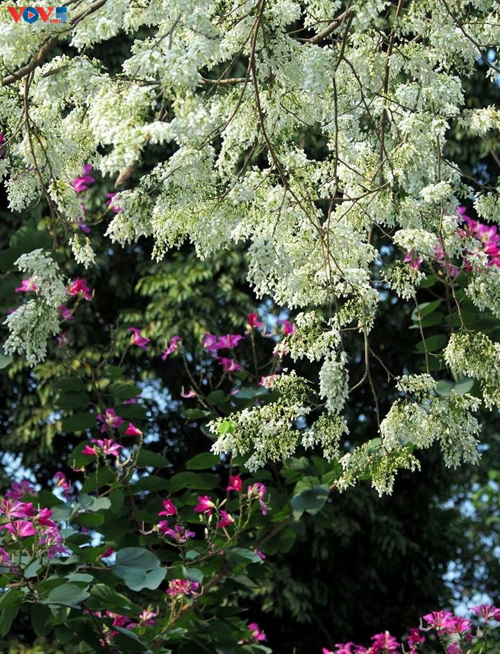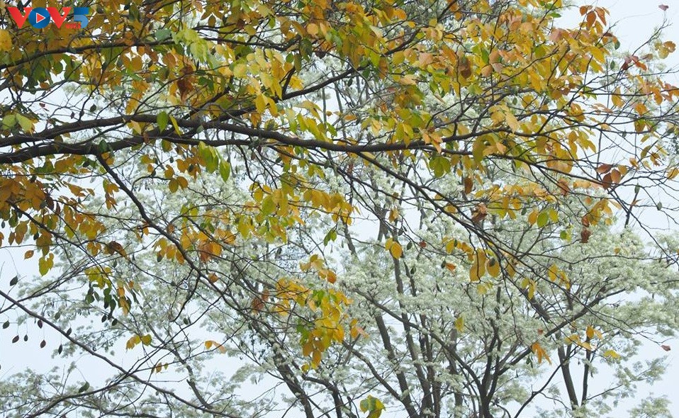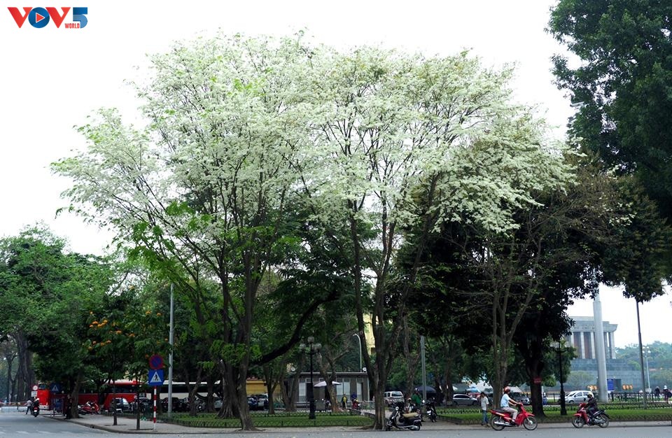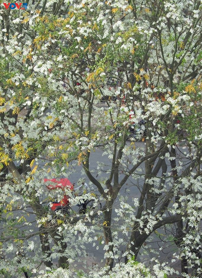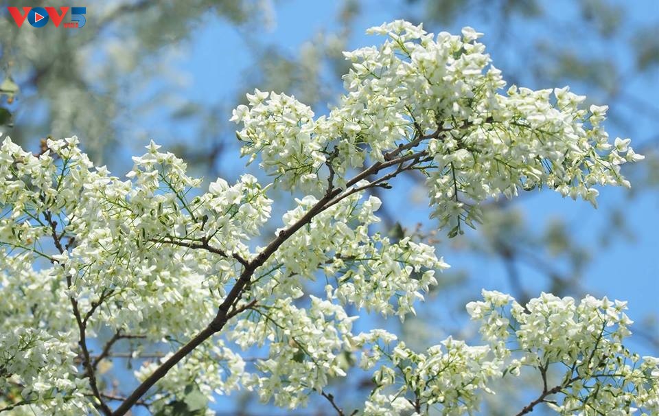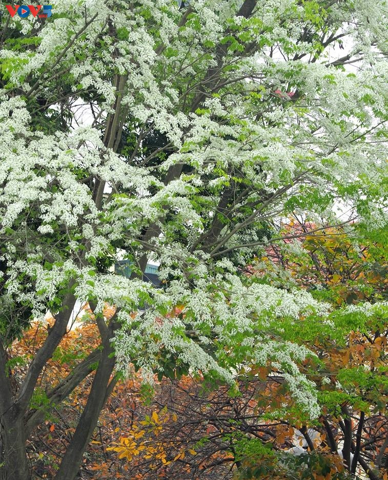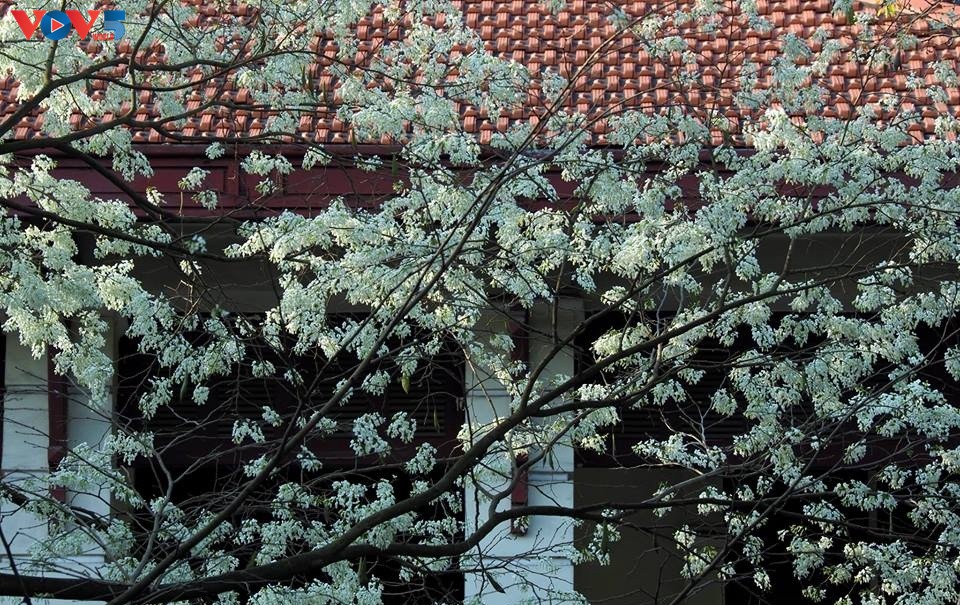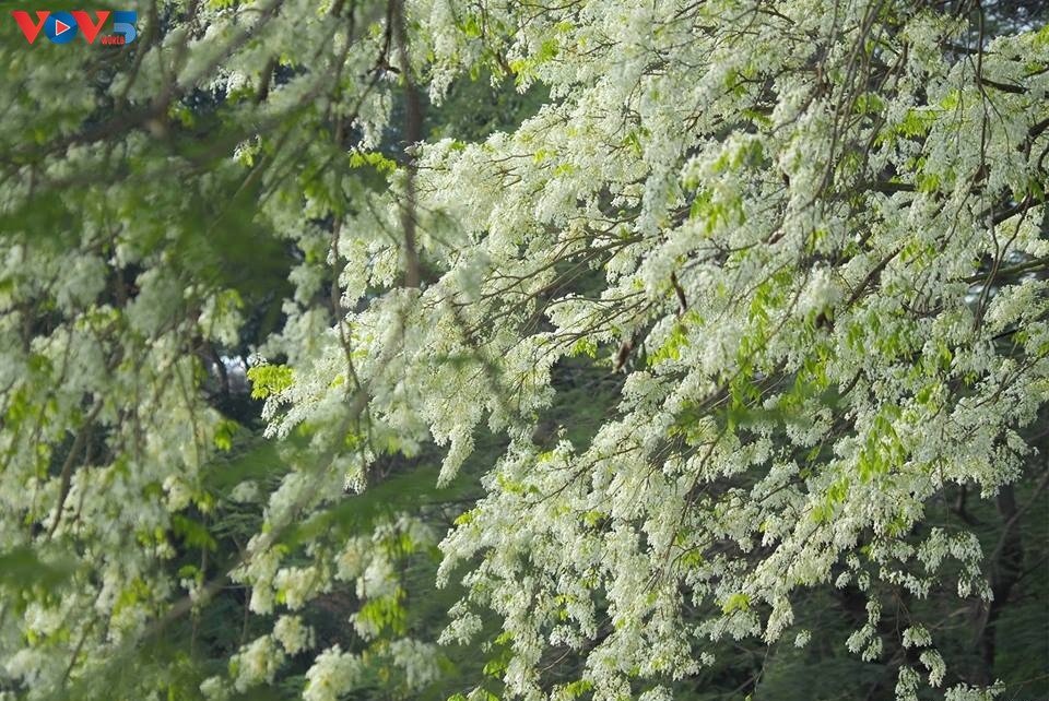 Xen giữa vạt lá non xanh biếc, từng chùm hoa trắng xóa như những bông tuyết mỏng manh, e ấp hệt như nụ cười của người thiếu nữ làm sáng rực cả góc phố.