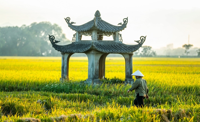 Cánh đồng lúa đang nở rộ ở thôn Thuỵ Khuê (xã Sài Sơn, huyện Quốc Oai, TP Hà Nội), lúa vàng óng dưới ánh nắng chiều tà
