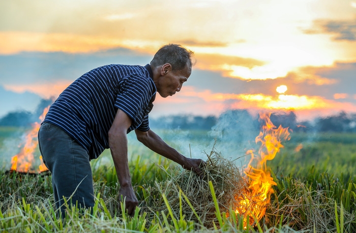 Một người đàn ông đang đốt rơm tại thửa ruộng nhà mình, sau khoảng thời gian gặt, đất ở đây sẽ được nghỉ ít ngày và vào vụ sau