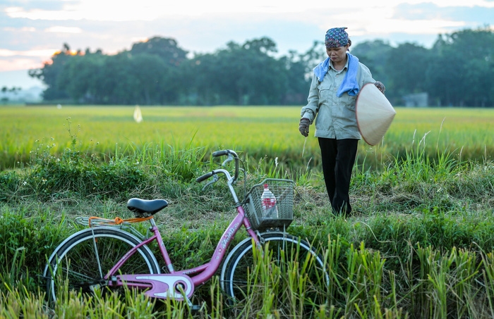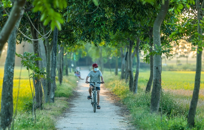 Nhiều người dân vùng quê tranh thủ đạp xe tập thể dục và nhìn ngắm những cánh đồng lúa chín, vàng óng trong nắng chiều