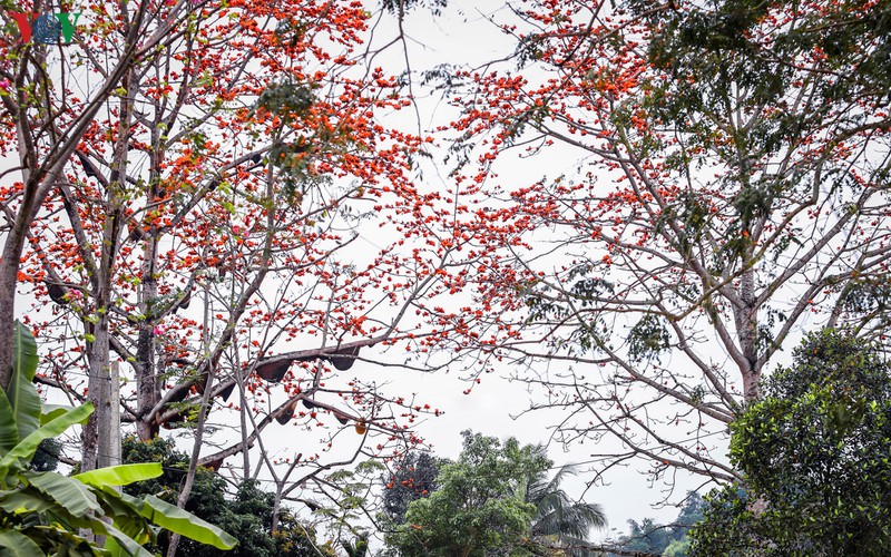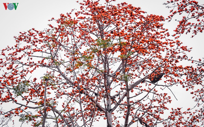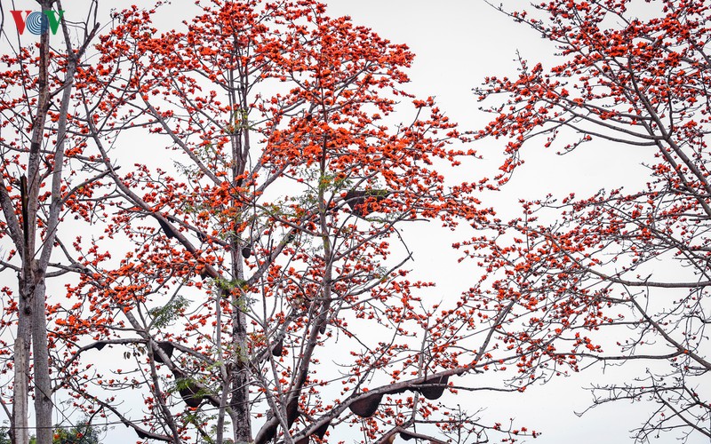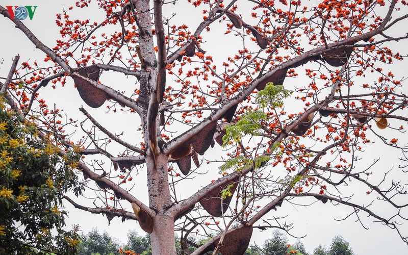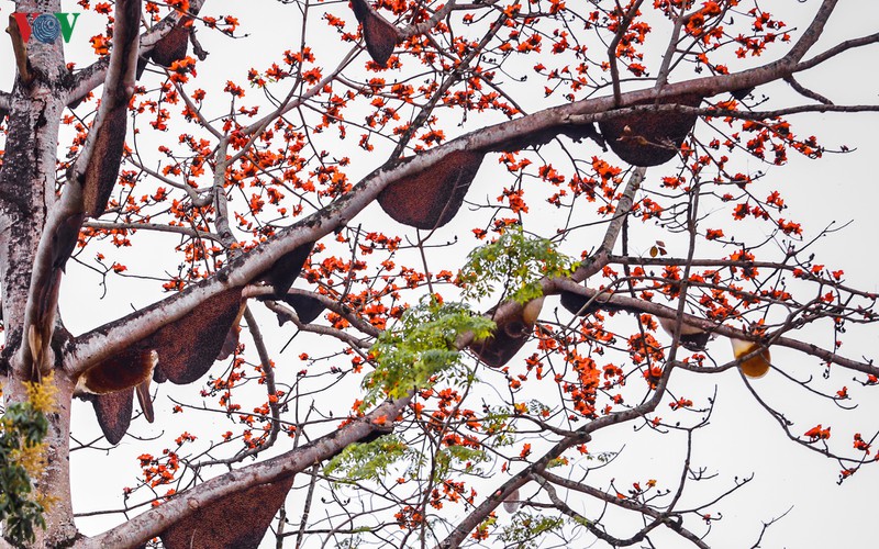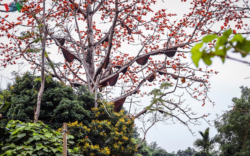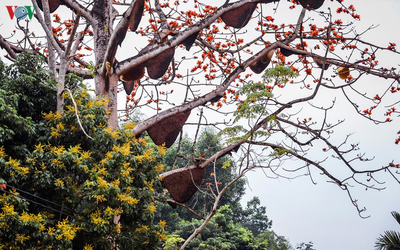 Thời điểm này, cây gạo bung nở với những bông hoa đỏ rực. Những tổ ong là điểm nhấn khiến nó khác biệt với những cây gạo khác trong vùng.
