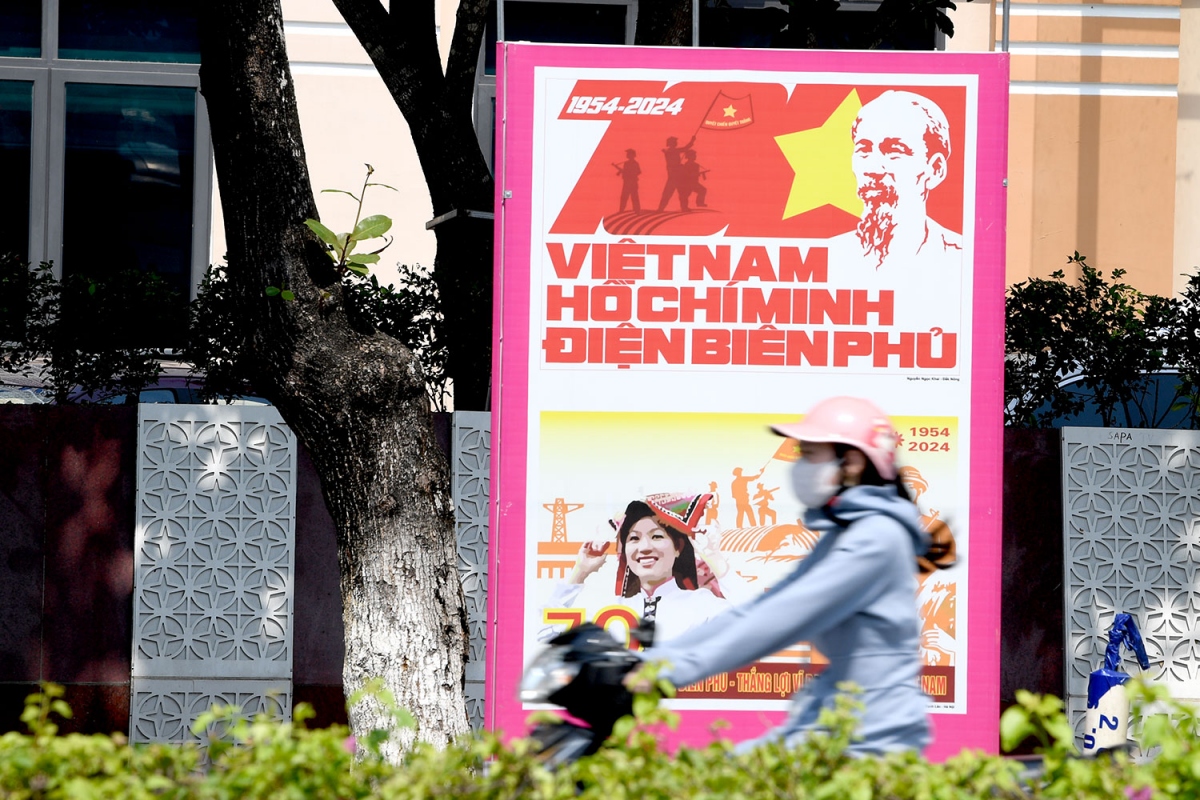 | Cờ hoa, khẩu hiệu dọc con đường mang tên vị tướng huyền thoại Võ Nguyên Giáp. |