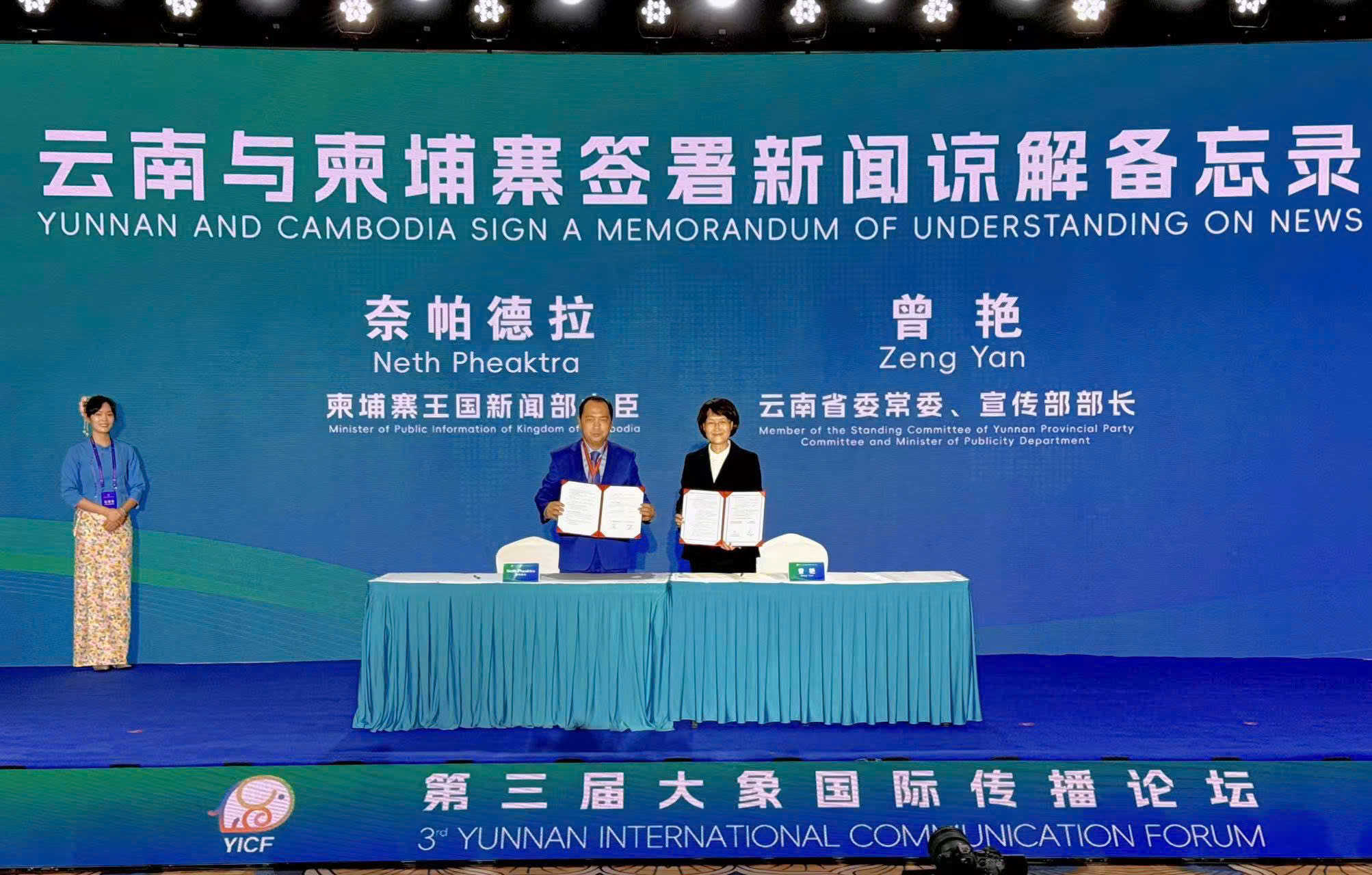 Tại lễ khai mạc, bà Tăng Yến và ông Neth Pheaktra đã ký biên bản ghi nhớ hợp tác trong lĩnh vực truyền thông giữa tỉnh Vân Nam và Bộ Thông tin Campuchia. |