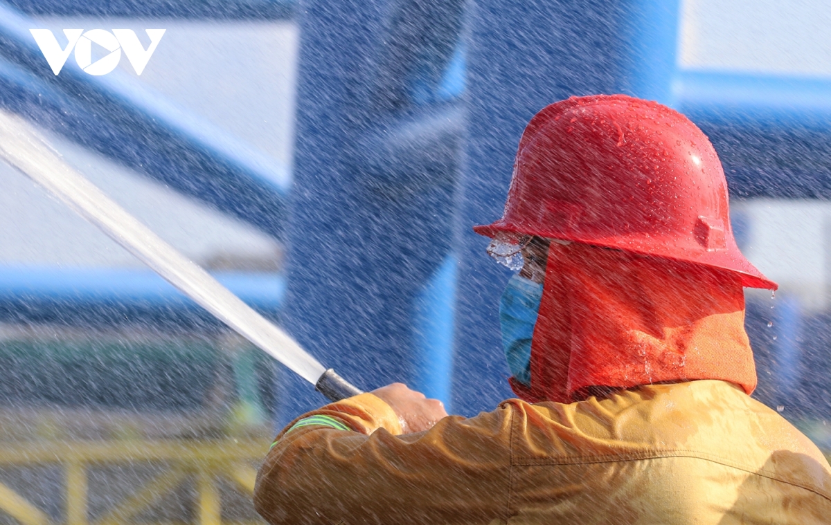 Xe chữa cháy, xe cần vươn, xe trạm bơm tiếp tục phun nước làm mát tàu bị cháy, ngăn chặn cháy lan sang các tàu lân cận, số còn lại chuẩn bị các bình chữa cháy sẵn sàng xử lý sự cố phát sinh.