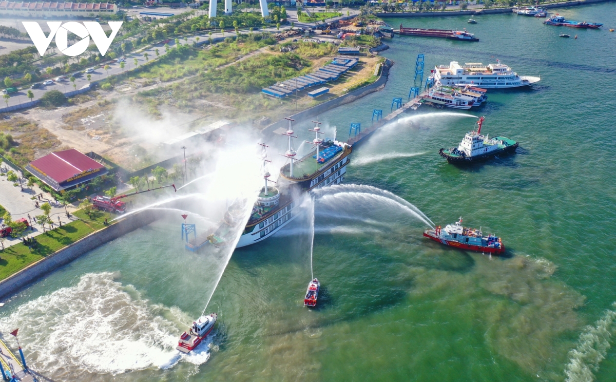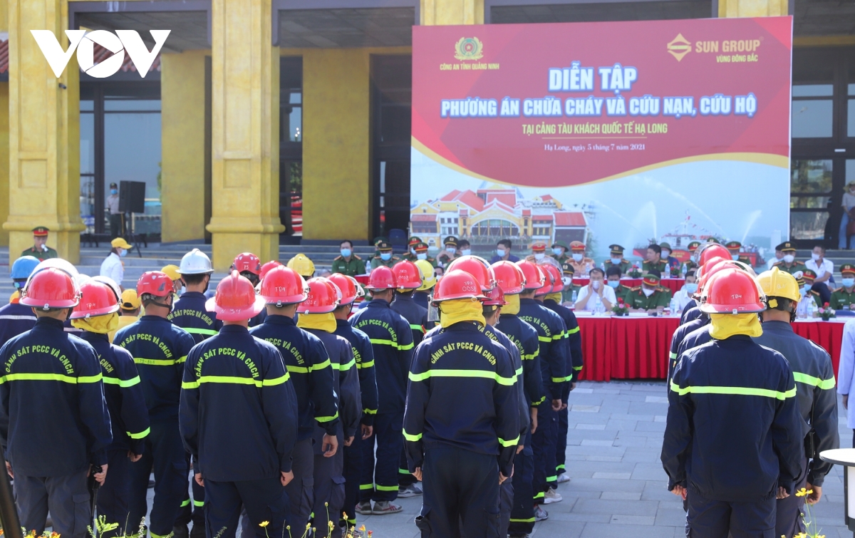 Hơn 200 người tham gia cuộc diễn tập có quy mô lớn nhất từ trước tới nay, triển khai phương án chữa cháy và cứu nạn cứu hộ tại cảng tàu khách trên khu vực vịnh Hạ Long, Quảng Ninh.