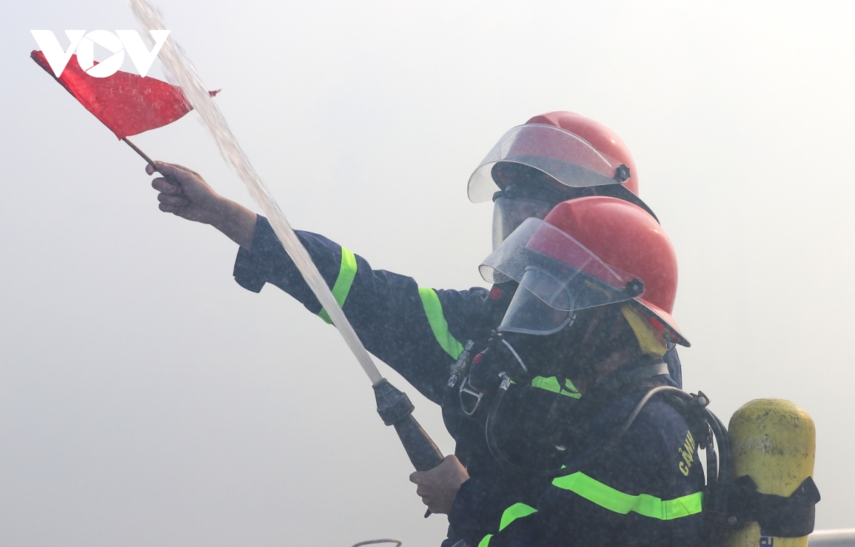 Cano của lực lượng Cảnh sát PCCC và CNCH có mặt tại hiện trường, triển khai 2 lăng giá vừa di chuyển vừa phun nước làm mát tàu bị cháy, ngăn chặn cháy lan, đồng thời đưa chiến sĩ lên tàu phối hợp chữa cháy và cứu hộ.