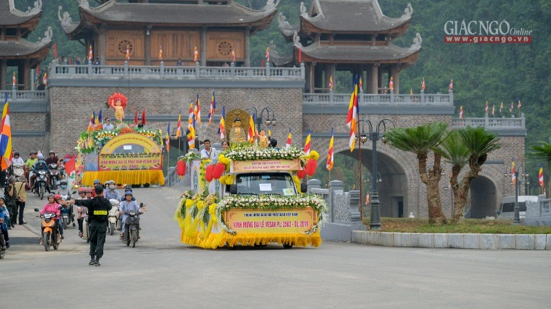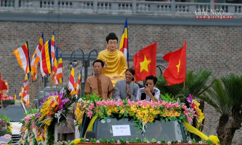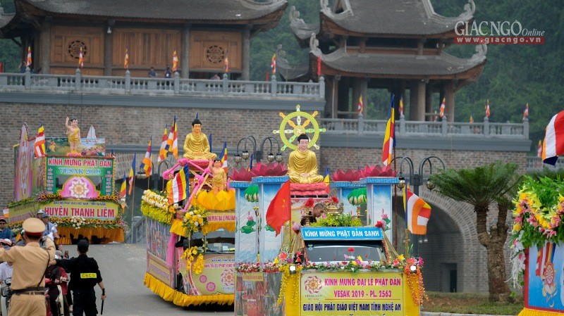 Chiều 11-5, nằm trong chương trình của Đại lễ Vesak Liên Hiệp Quốc 2019 tại chùa Tam Chúc (huyên Kim Bảng, tỉnh Hà Nam), buổi diễu hành xe hoa từ thị xã Phủ Lý về nơi tổ chức Đại lễ thu hút hàng ngàn Phật tử tham dự.