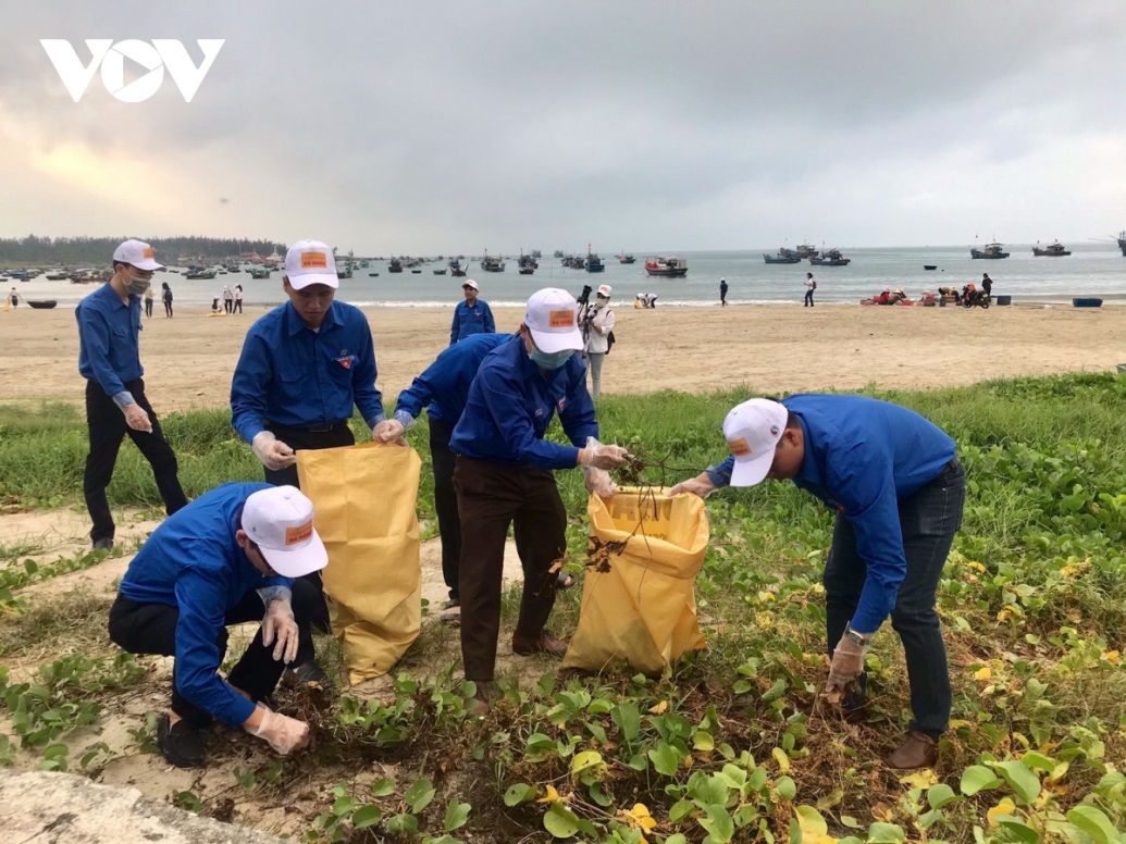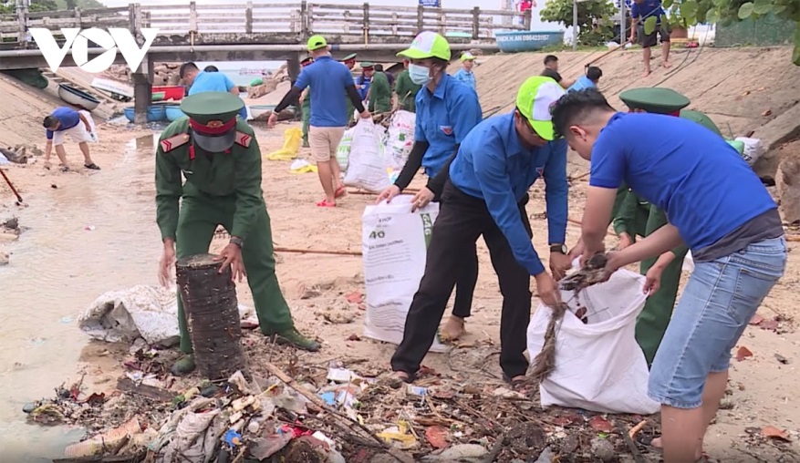 Cũng tại Đà Nẵng, trong một hoạt động khác, hơn 100 đoàn viên, thanh niên chia làm nhiều nhóm thu gom túi ni lông, chai nhựa, rác thải tổng hợp dọc bờ biển Nguyễn Tất Thành, thành phố Đà Nẵng. Ảnh: VOV |
