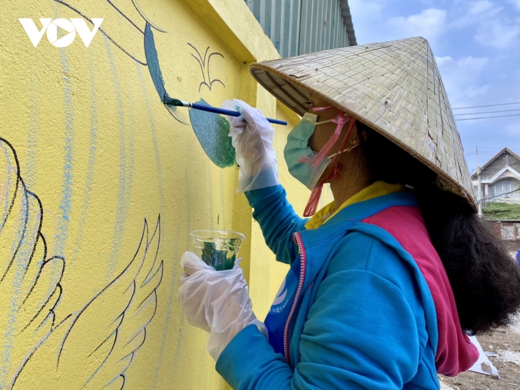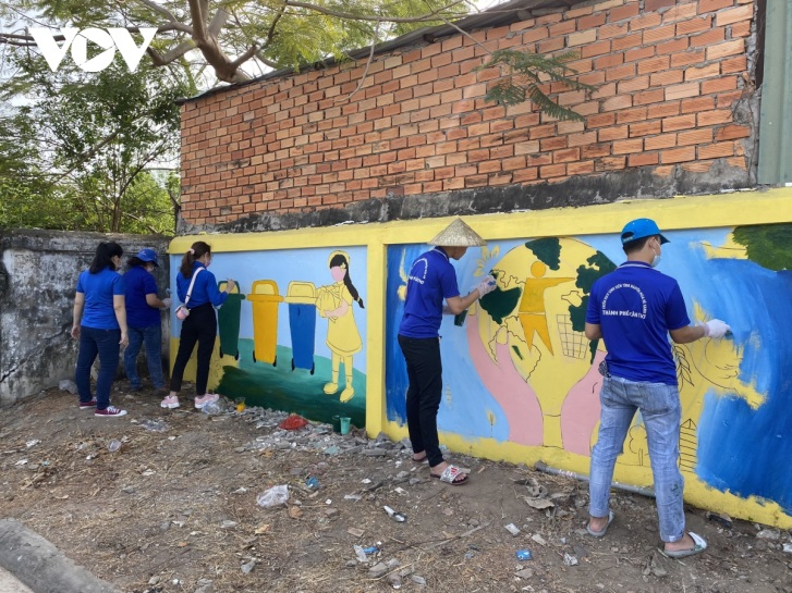 Các đoàn viên, thanh niên Cần Thơ đã thay “áo mới” cho bức tường dài 100m bằng những hình ảnh sinh động, ý nghĩa về bảo vệ môi trường. Ảnh: VOV |