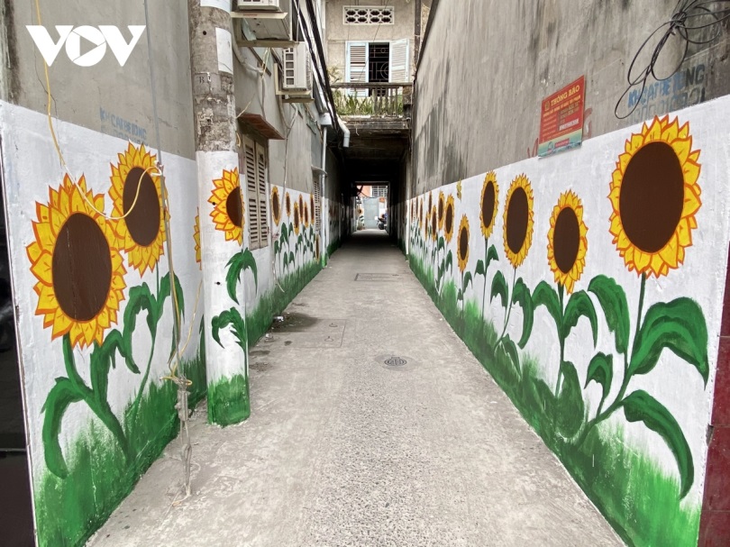 Bức tường hoa hướng dương tạo không gian đẹp cho khu vực hẻm 108 - 114, đường Cách mạng Tháng 8, Ninh Kiều, Cần Thơ. Ảnh: VOV |