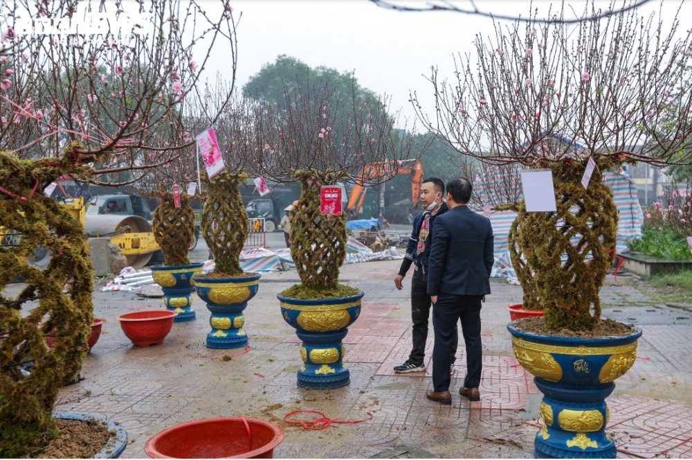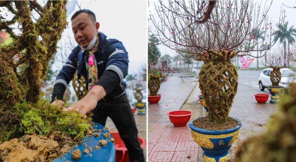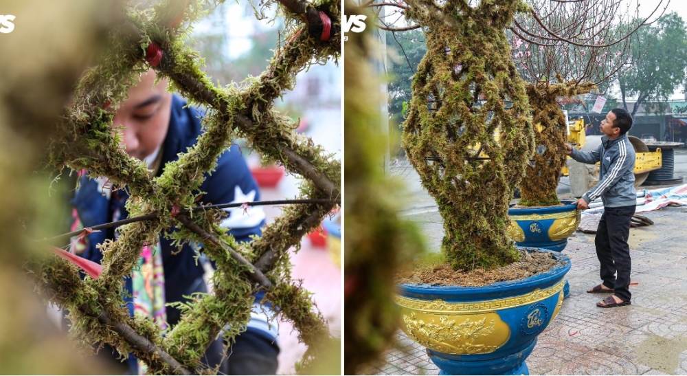 Để uốn cây đào thành hình dạng chiếc bình và chờ ra hoa, người thợ phải mất ít nhất 6 năm. Có 2 loại đào được sử dụng là đào bích và đào phai. |