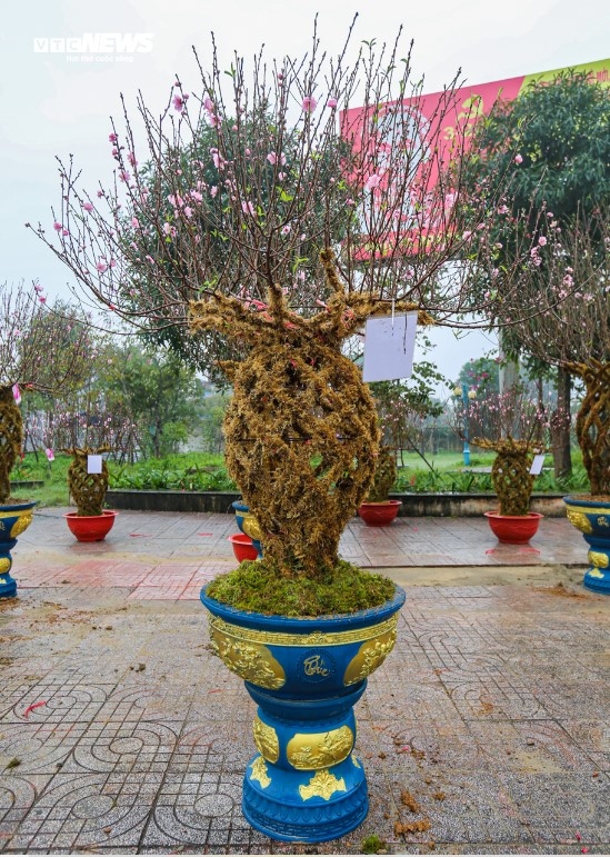 Mỗi chậu đào lộc bình cao 1,5-2m. Cành lá được cắt tỉa, tạo thế uốn lượn. |