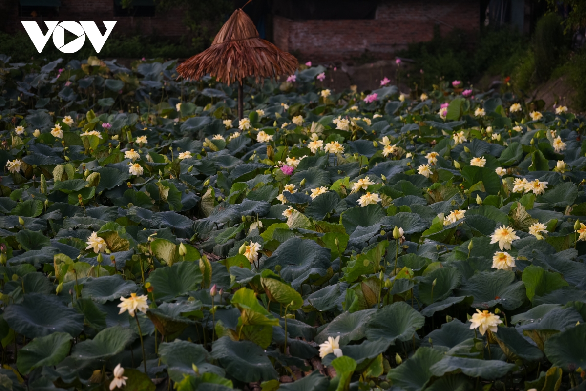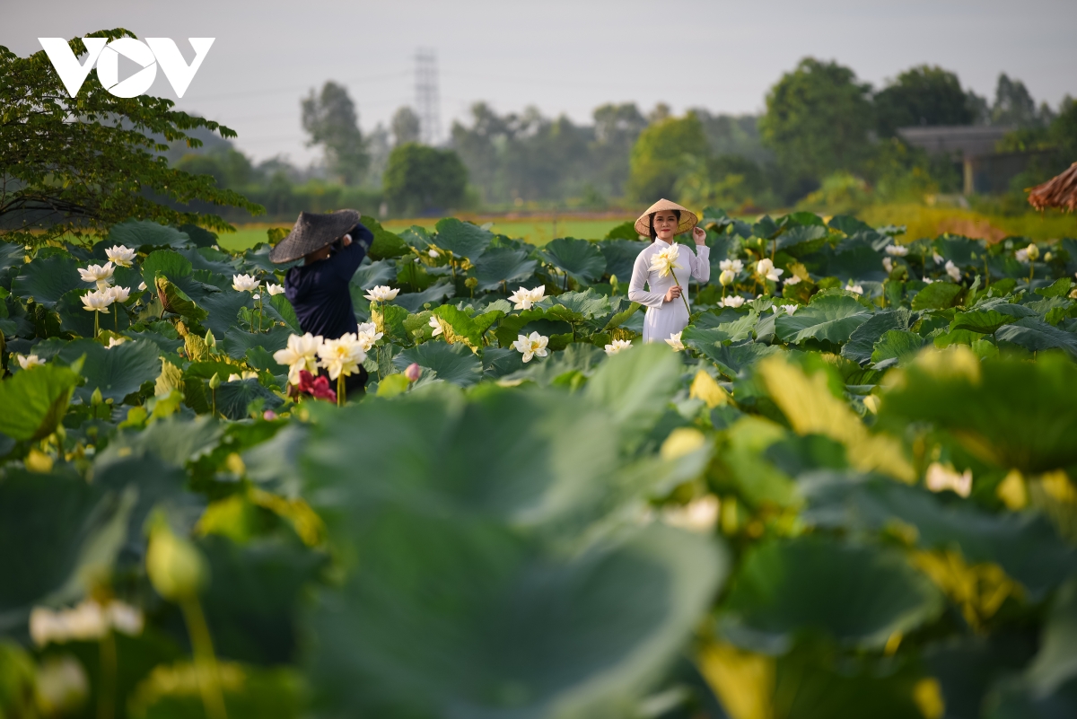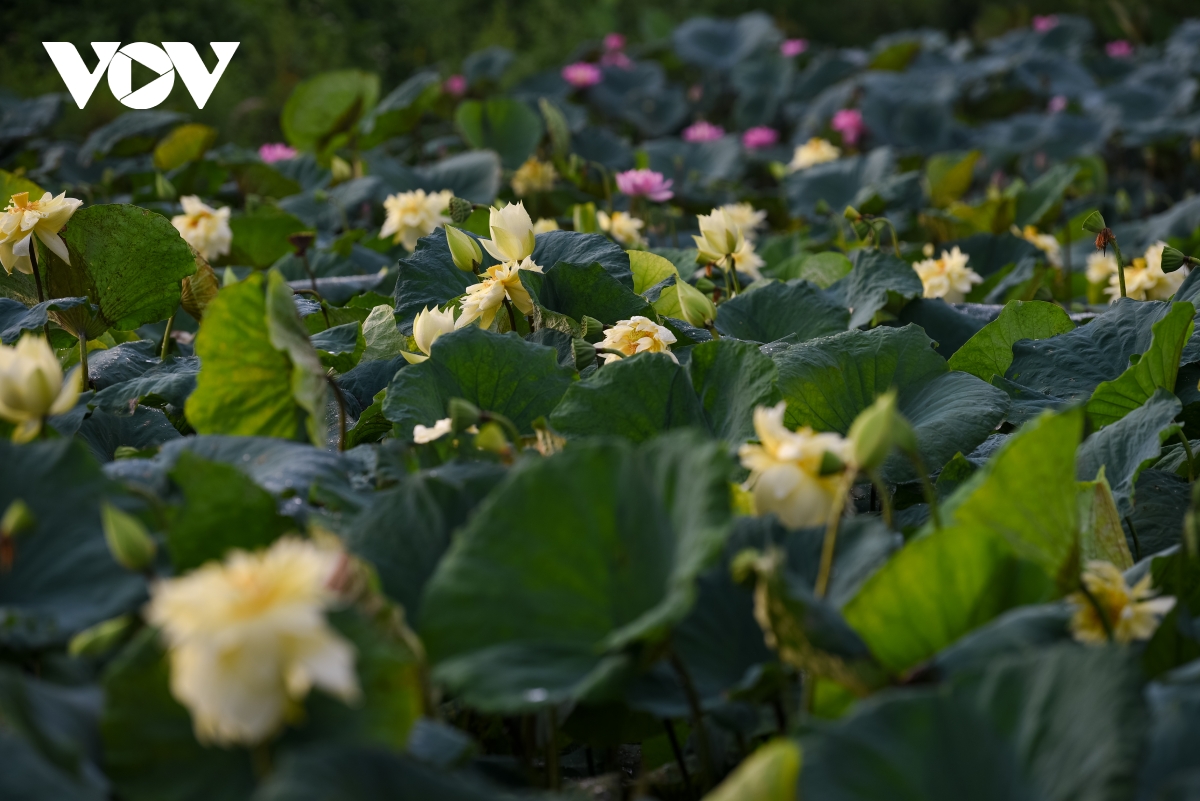 Năm nay, cánh đồng sen đã bung nở kín đầm, trở thành điểm dừng chân của nhiều du khách. |