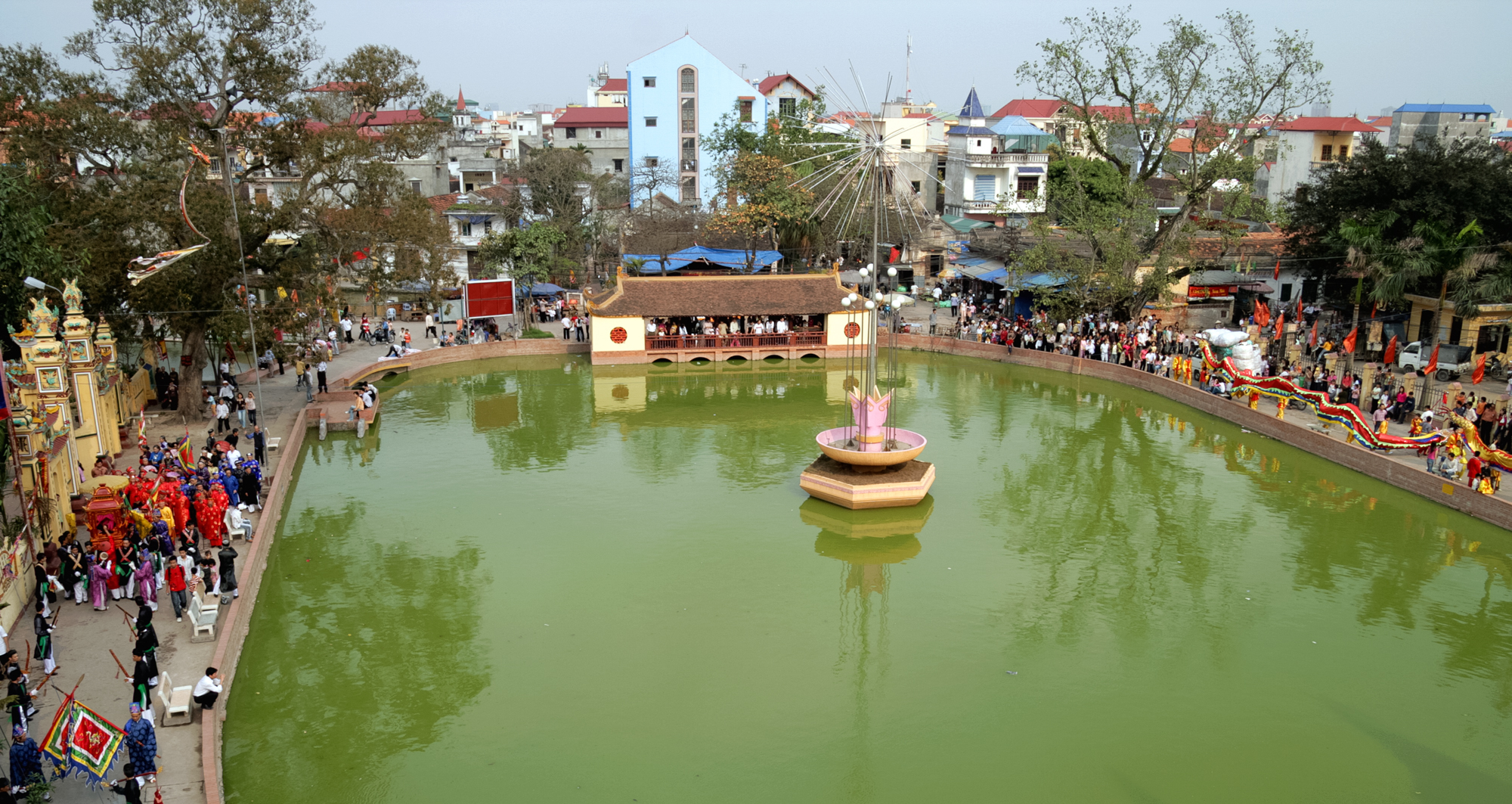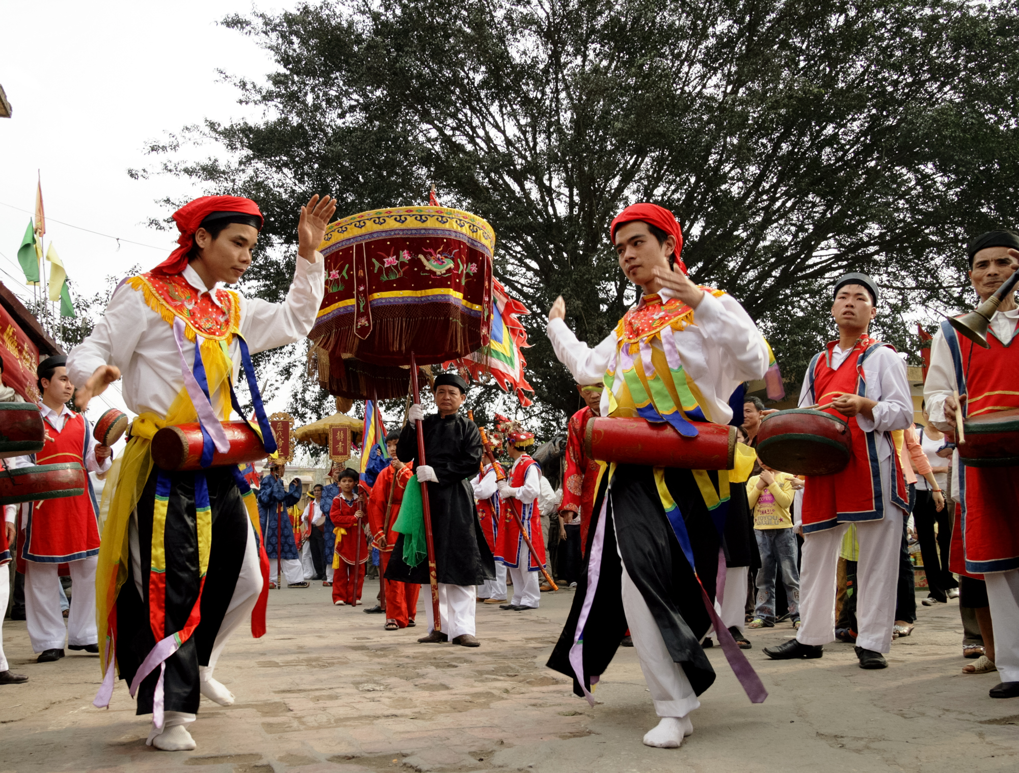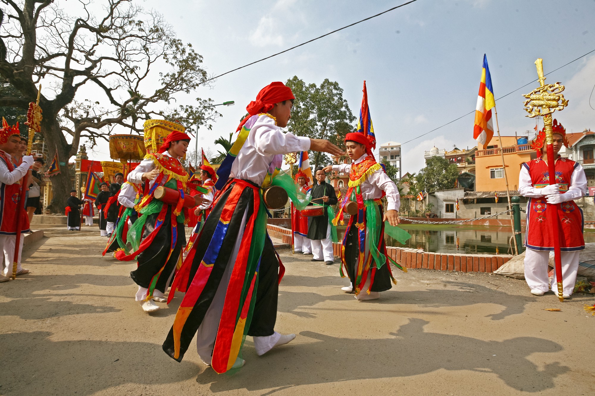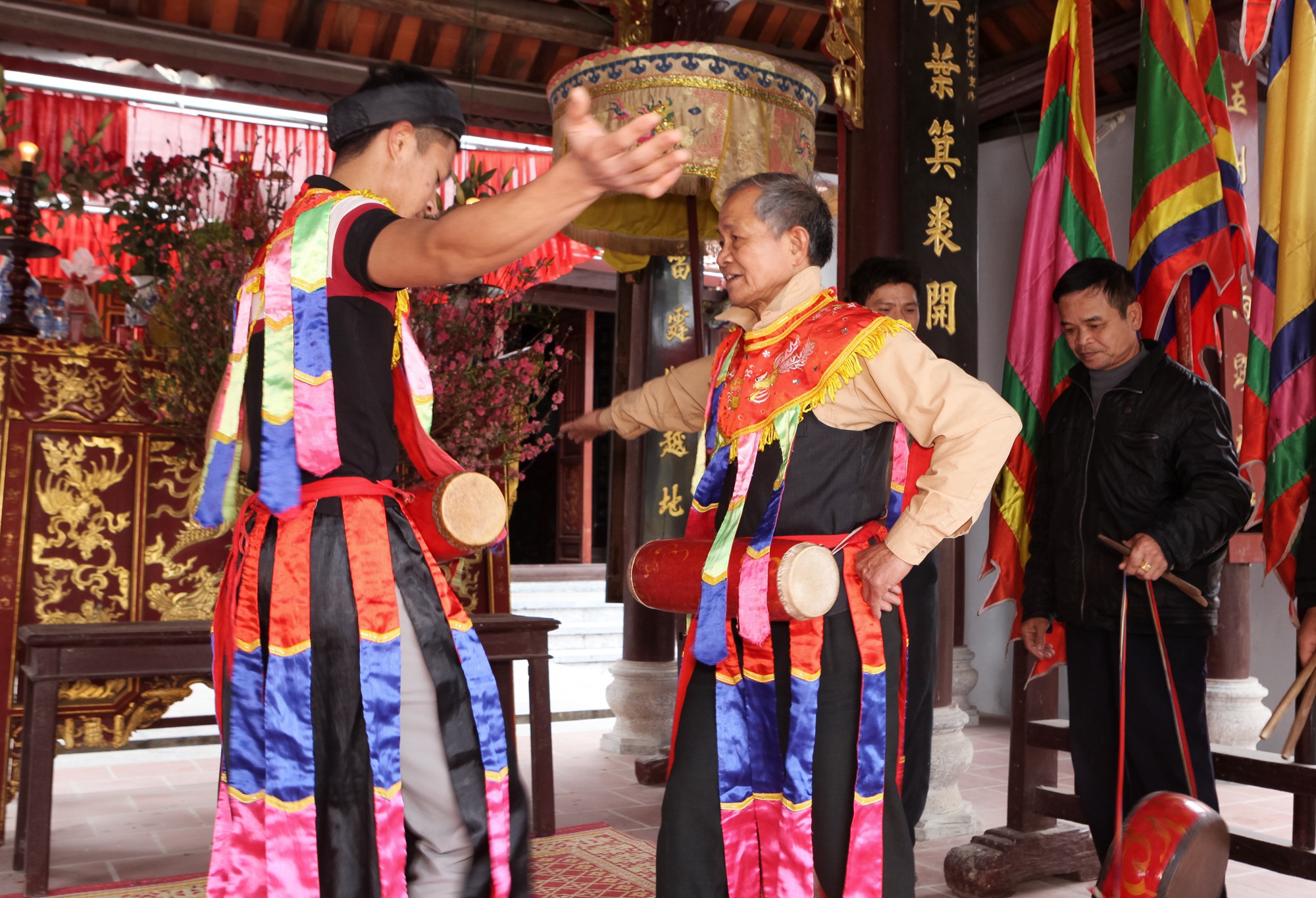 Thật ấn tượng với điệu múa bồng trong buổi lễ tế nhập tịch. Điệu múa là một phần không thể thiếu của lễ hội, vì nó mang ý nghĩa là để chúc tụng nhà vua. Theo các cụ kể lại, ngày xưa trong triều đình vào dịp lễ hội, múa trống bồng được múa trong đám rước và trước Phương Đình. Cứ mỗi lần trong Đại Đình lễ vật được dâng lên Vua là bên ngoài múa trống bồng và múa Sanh Tiền lần lượt được múa. Đây là điệu múa được làng Triêu Khúc duy trì và phát huy rất tốt. Đội múa Bồng năm nay gồm hai đôi đều là nam giới cải trang thành nữ chít khăn mỏ quả, mặc áo váy, phấn son đeo trống bồng biểu diễn trong tiếng nhạc, chuông trống lễ.