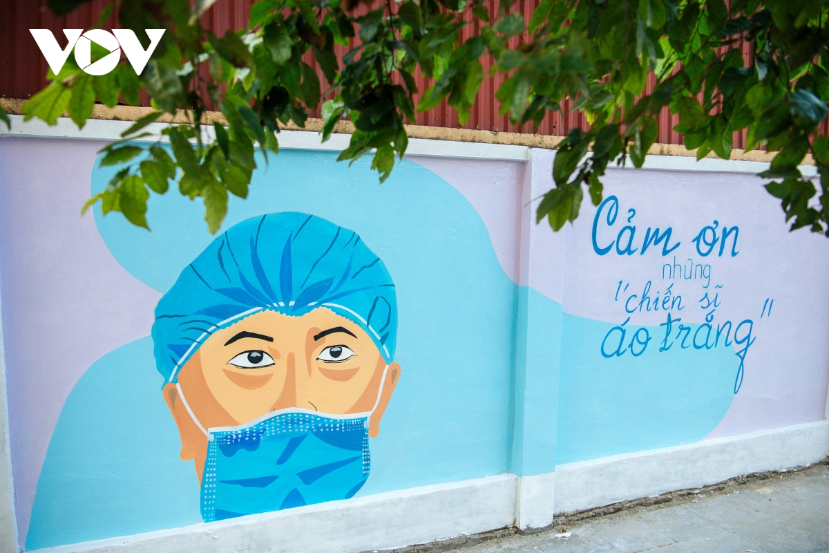 Các bức bích hoạ luôn kèm theo những thông điệp như: "Chung sức đồng lòng chống dịch Covid-19", "Vì một thế giới không Covid", "Ngăn chặn, phát hiện cách ly, khoanh vùng dập dịch Covid-19"...