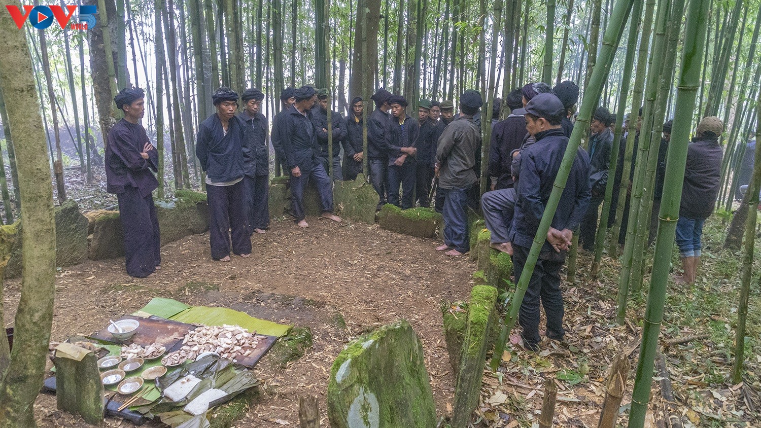 Dân bản đến vị trí bàn thờ thần rừng hành lễ cầu xin thần rừng che chở cho cả thôn bản.