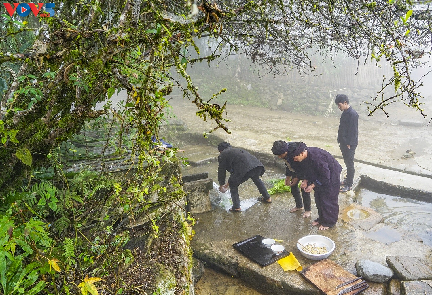 Chuẩn bị lễ vật cúng tại nguồn nước thiêng.