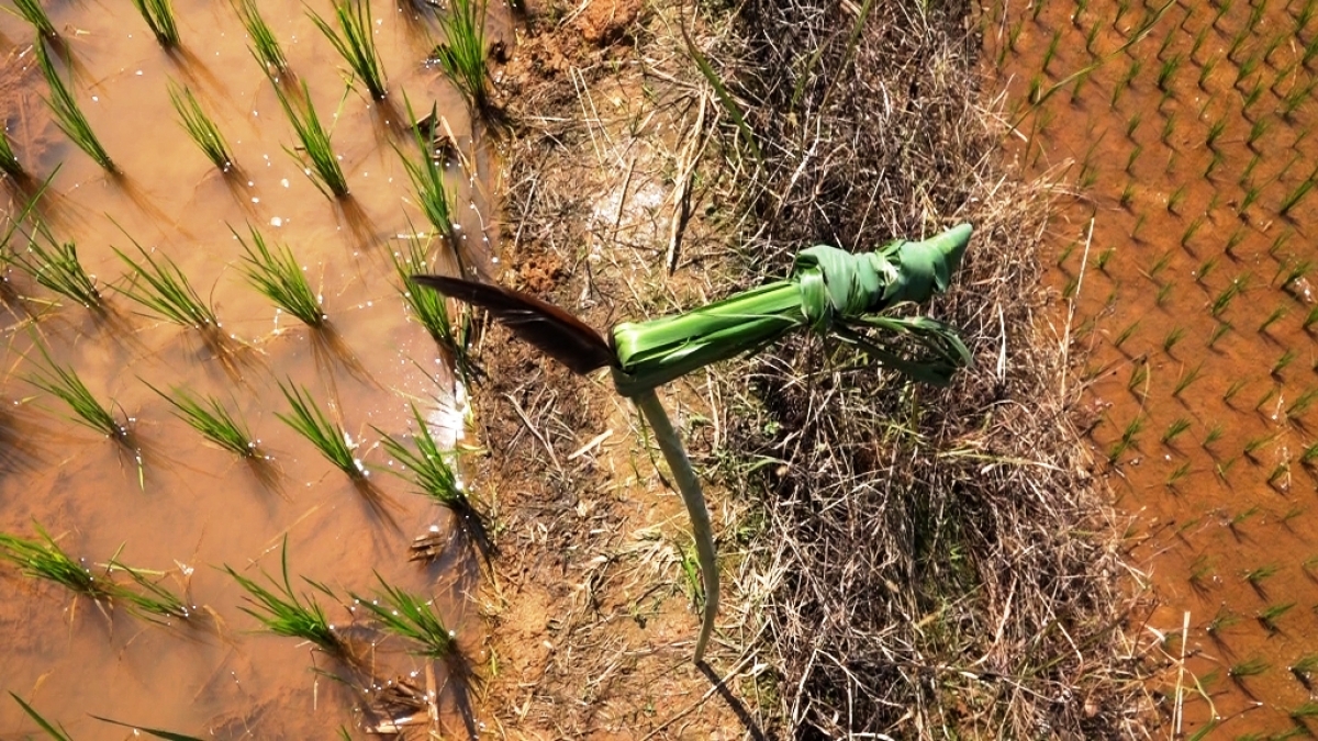 Kết thúc nghi lễ, chủ hộ hoặc một người trong gia đình sẽ mang những cây lau trước đó đã được cắm lông gà đi cắm vào bờ các thửa ruộng. Đến thửa cuối cùng, cây lau phải quay ngược lại thể hiện ruộng của gia đình chỉ đến đó và thổ công, thổ địa hãy bảo vệ những thửa ruộng của gia đình.