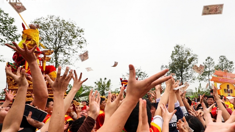 (VOV5) - Trong lễ hội đền Sái tại làng Thụy Lôi (Hà Nội), “vua, chúa sống” ngồi trên kiệu phát lộc suốt hơn 3 tiếng, thu hút đông đảo người dân và du khách theo dõi.
