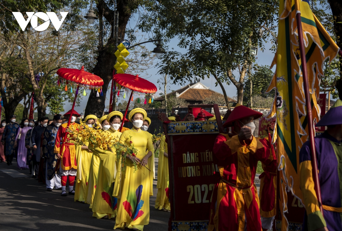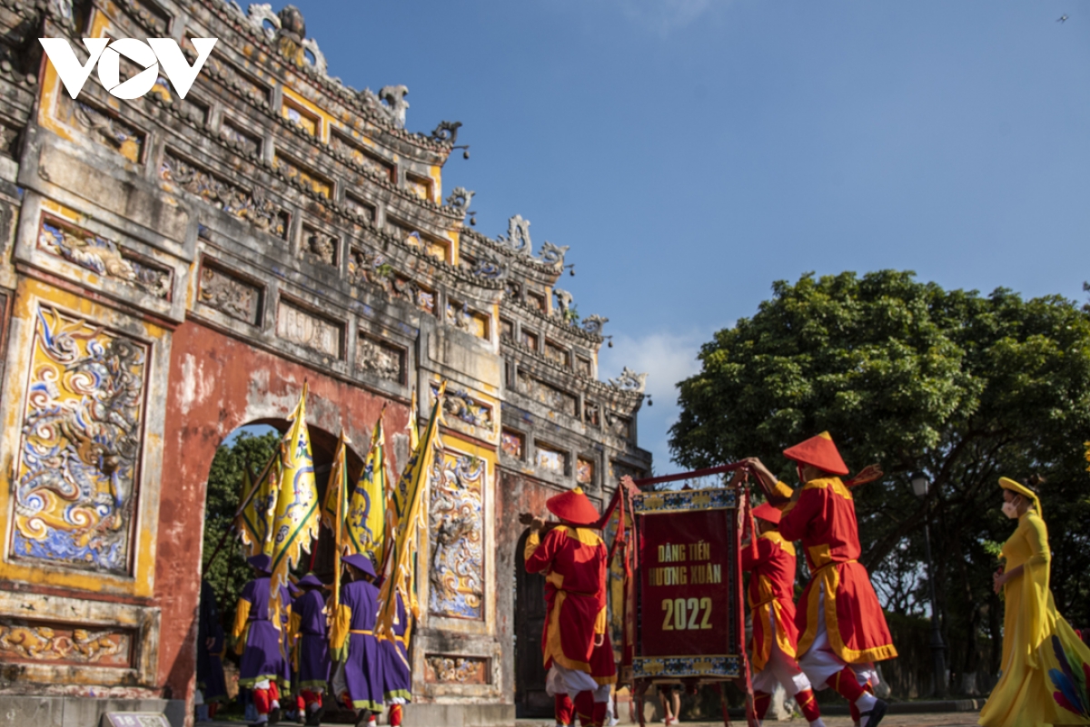 Điểm nhấn của chương trình năm nay là Lễ rước “Dâng tiến Hương Xuân” vào Thế Miếu để cúng các vị Vua Nguyễn nhân dịp năm mới, diễn ra sáng nay 26/1 (nhằm ngày 24 tháng Chạp năm Tân Sửu).