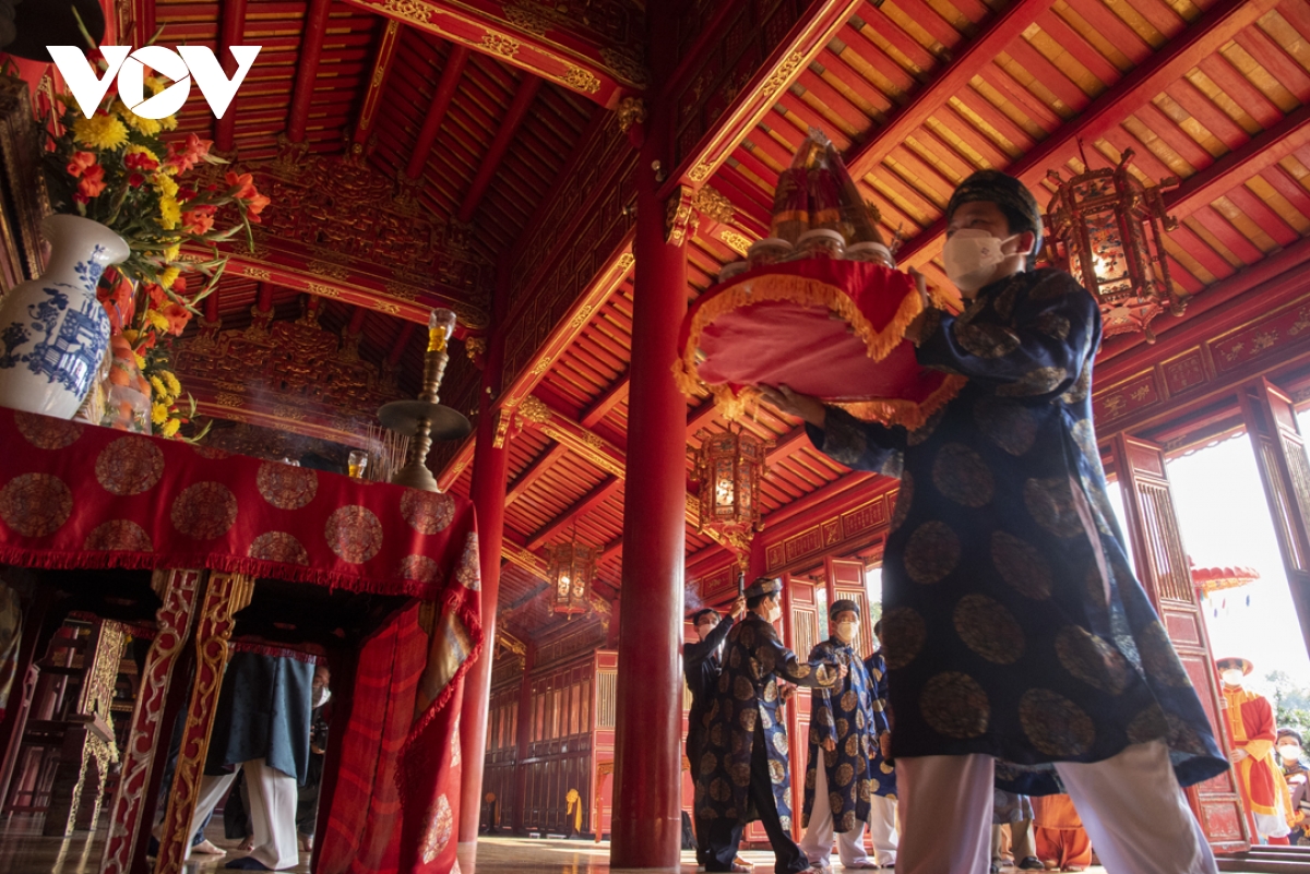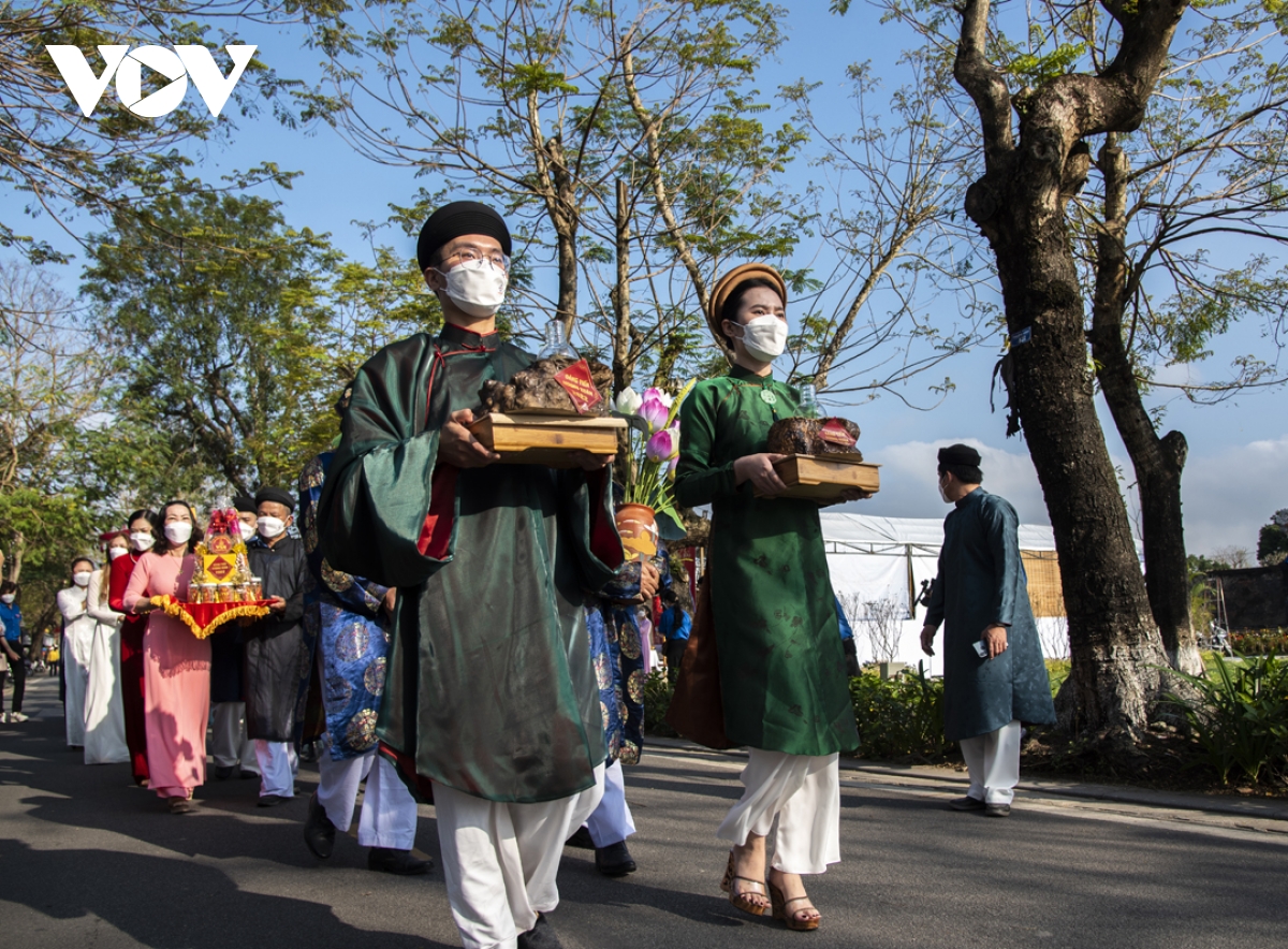 Đoàn rước cùng các sản vật xứ Huế được diễu hành qua các tuyến đường, sau đó dâng lên ban thờ trong Thế Miếu, mong muốn dâng lên các bậc tiền nhân hương vị Tết xứ Huế.
