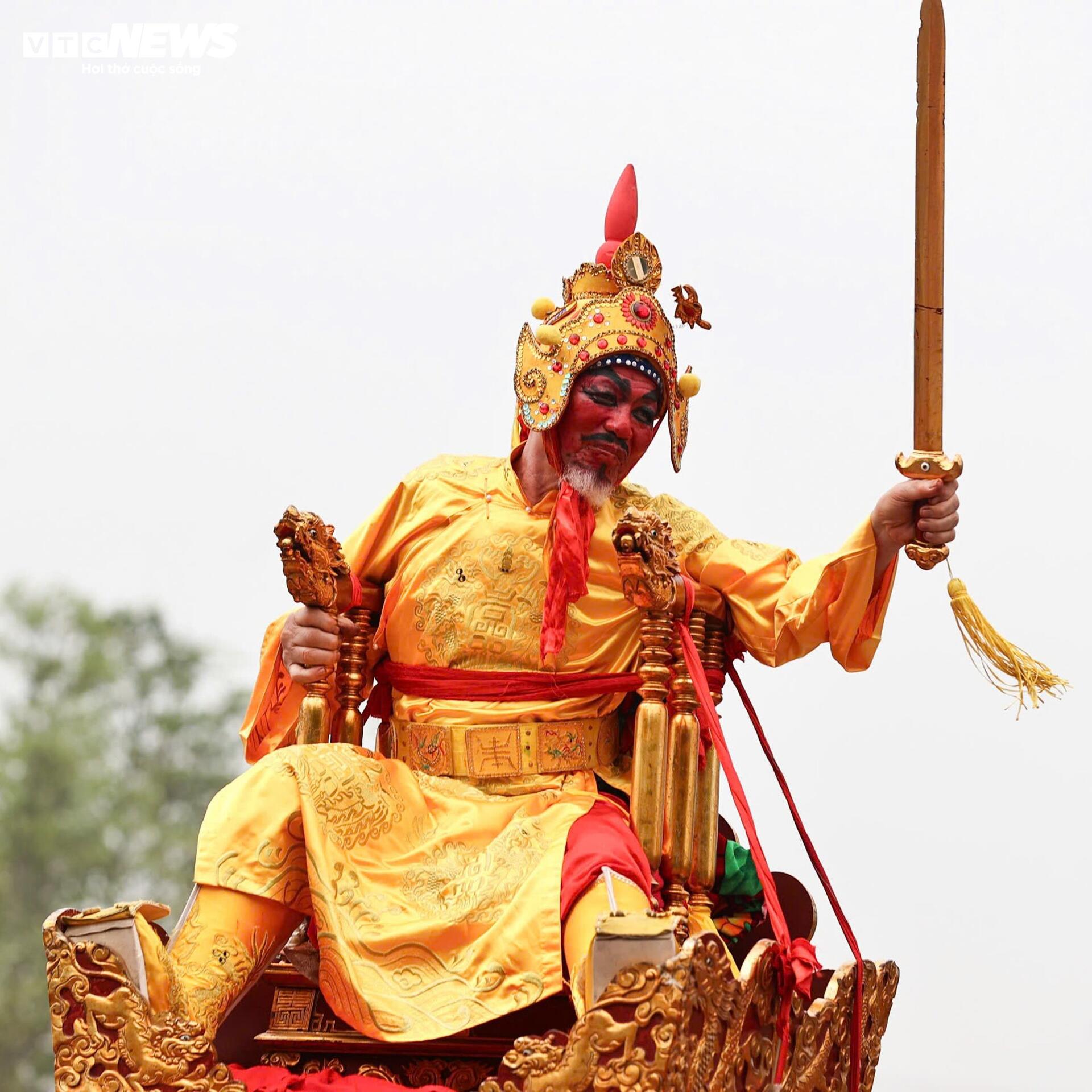 Vai “chúa” năm nay do ông Hồ Tiền Thức (73 tuổi), người làng Thuỵ Lôi đảm nhận. Gương mặt được trang điểm đậm, phía sau là đội hình quan lại theo nghi thức truyền thống.