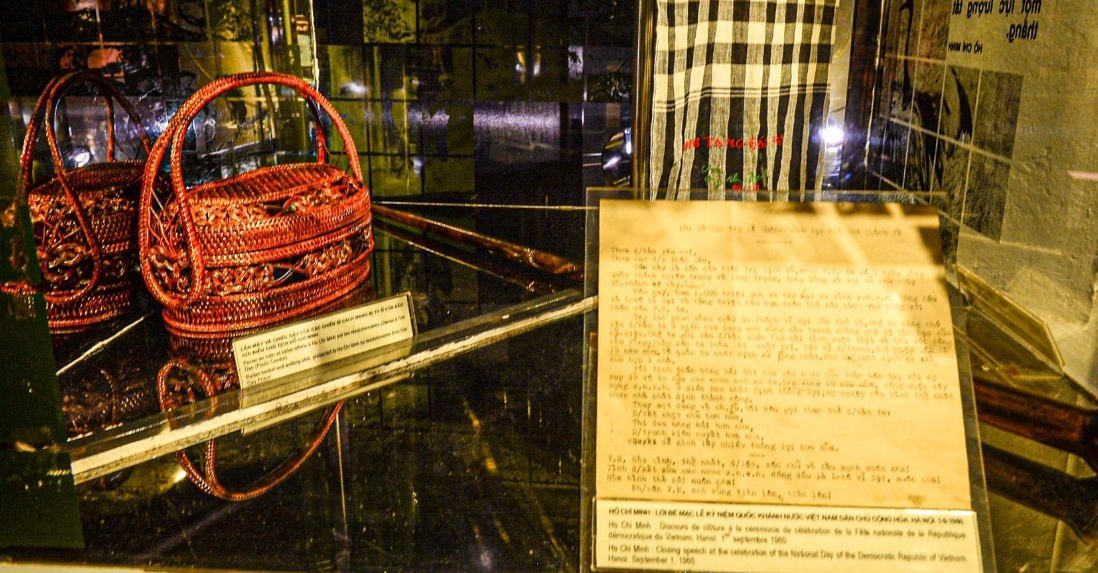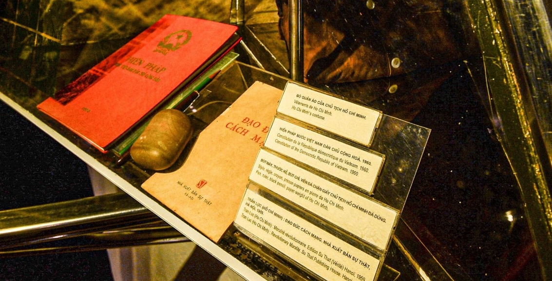 Trong ảnh là Hiến pháp nước Việt Nam Dân Chủ Cộng Hoà năm 1960 cùng bút máy, thước kẻ, viên đá chặn giấy,... Chủ tịch Hồ Chí Minh đã dùng.